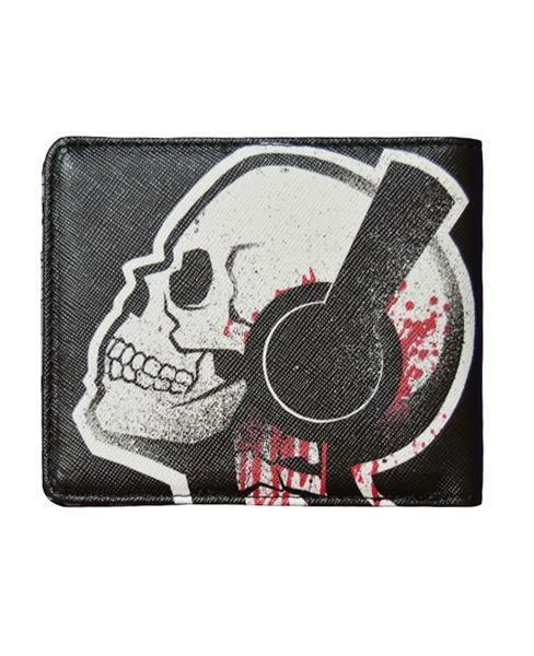 This is a bi-fold wallet with skull pattern on the inside of the wallet. The design featured on this wallet is Tone Death, a skeleton wearing headphones turned up so loud his ears are bleeding.