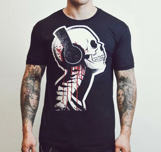 Original hand-drawn artwork of a skeleton wearing headphones turned up so loud his ears are bleeding.