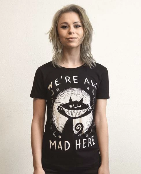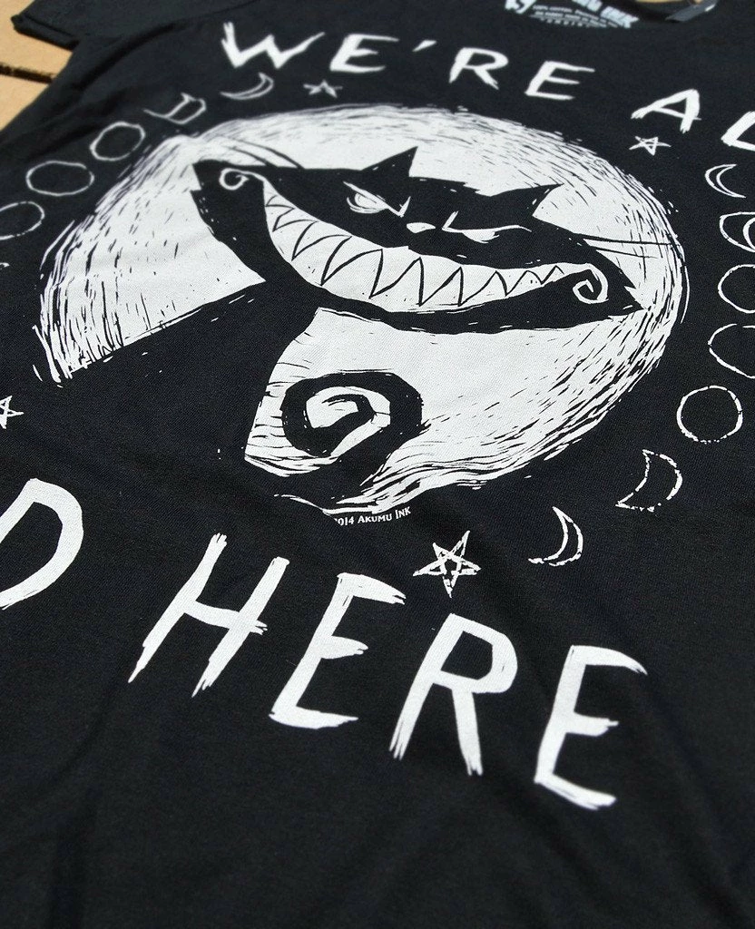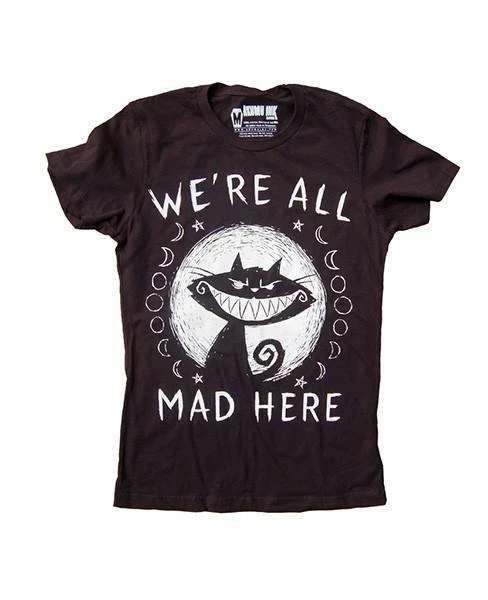 This short sleeve Akumu Ink crewneck t-shirt features hand-drawn artwork of the Cheshire Cat with the words “We’re All Mad Here.”