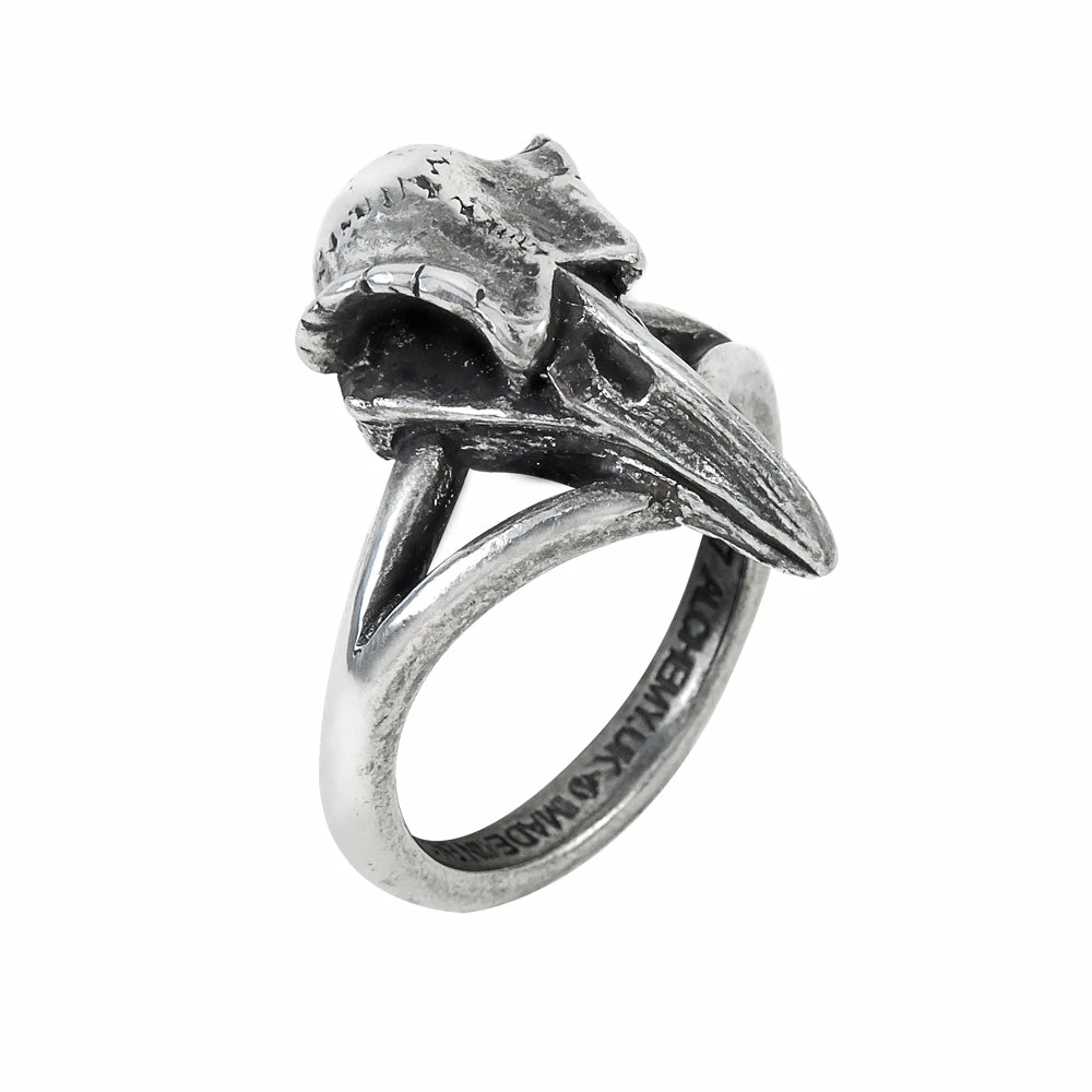 A smaller and more discreet raven’s skull ring, authentically detailed and in polished, antiqued pewter set upon a split ring shank.