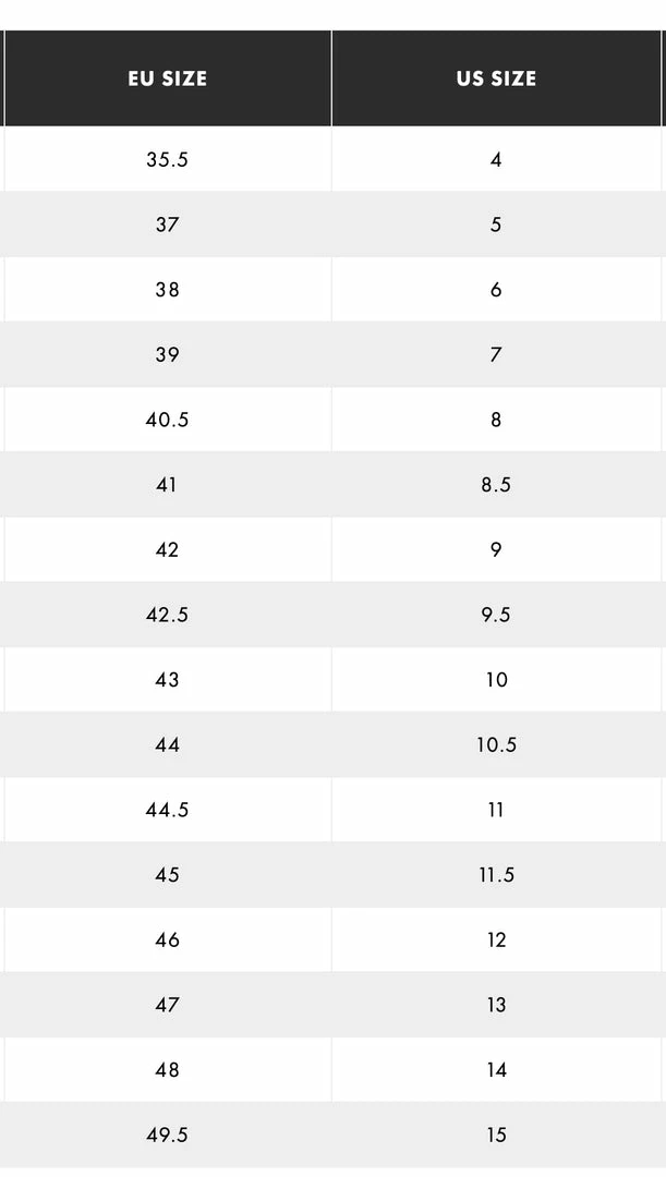 SIZE NOTE: EU to US sizing is approximate. Find a couple pairs of shoes or boots you currently own and check the EU sizing listed on the inside of the tongue. This will ensure the best fit for you.