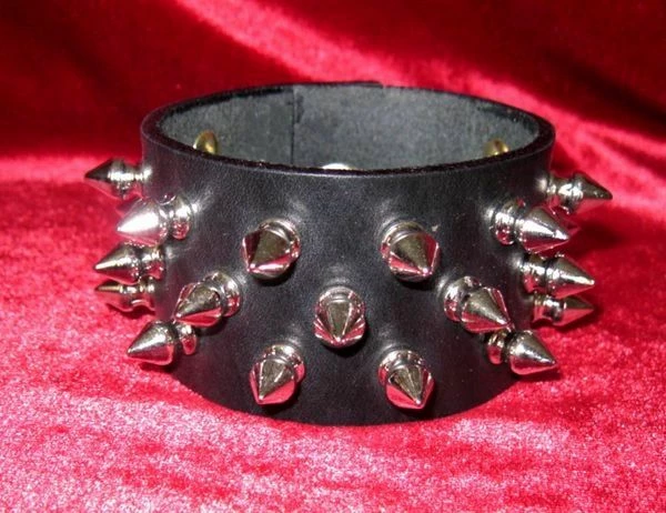 High quality leather wristband with 3 rows of staggered 5/8″ spikes. 1.75″ wide.