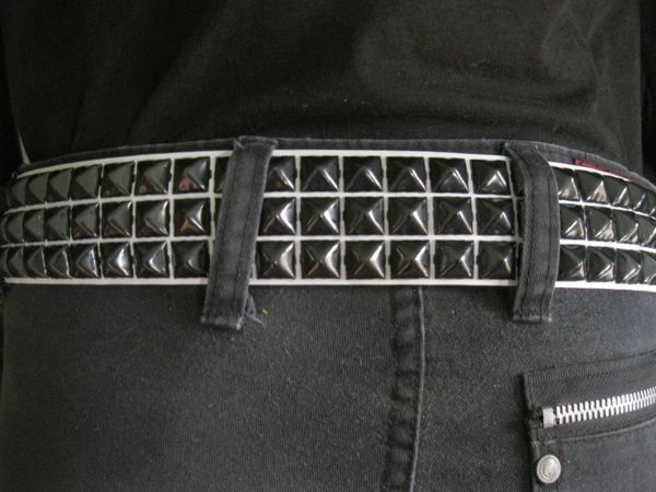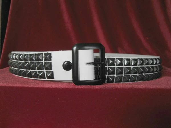 Description: This is a high quality leather belt with three rows of pyramid studs. It has a removable buckle. It is 1 3/4″ wide and adjusts with 5 holes at 1″ increments. The sizes shown are at the middle hole. Example a 34 would cover from 32 – 36″. We use only real leather from hand picked hides, not bonded leather. This belt will last a long long time. Choose your color, white leather with black pyramids, black leather with black pyramids or black leather with silver pyramids; and size from the drop down at the right of the photo.