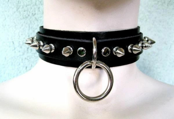 High quality leather bondage choker 1.25″ wide with three rings and 5/8″ long spikes.