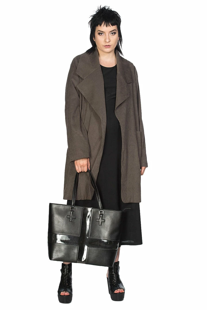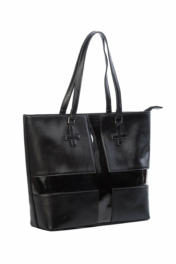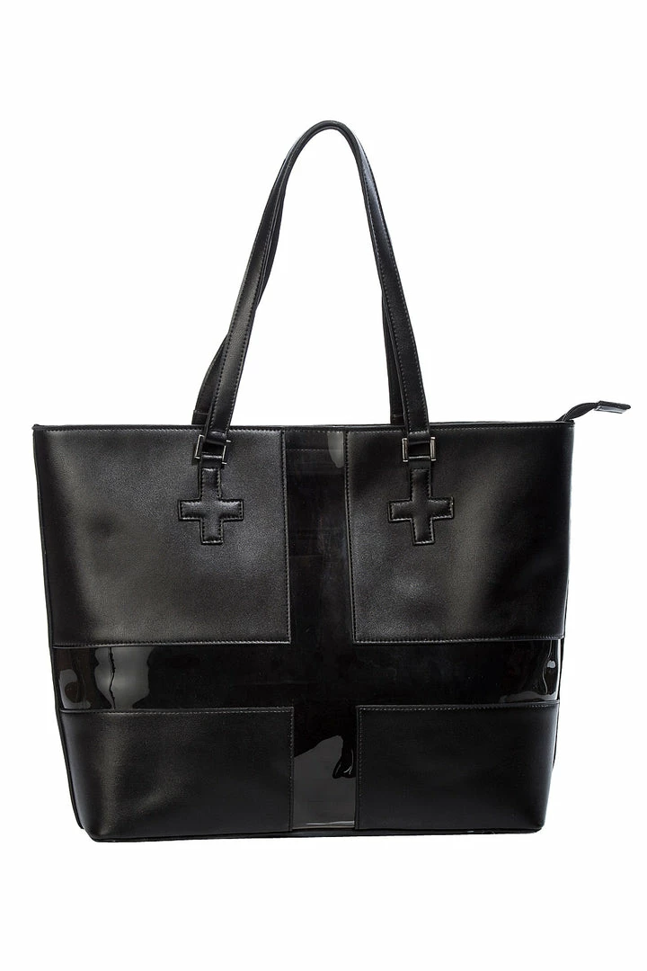 This vegan glam goth tote bag comes with front clear PVC panel shoulder straps and rear zip pocket.
