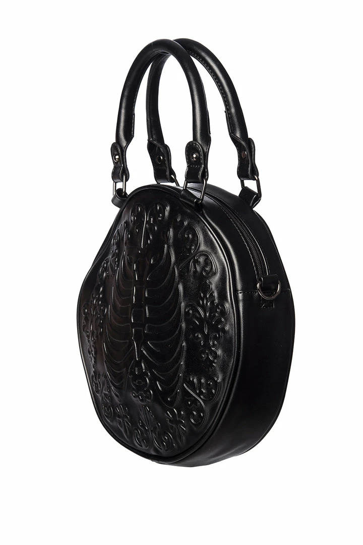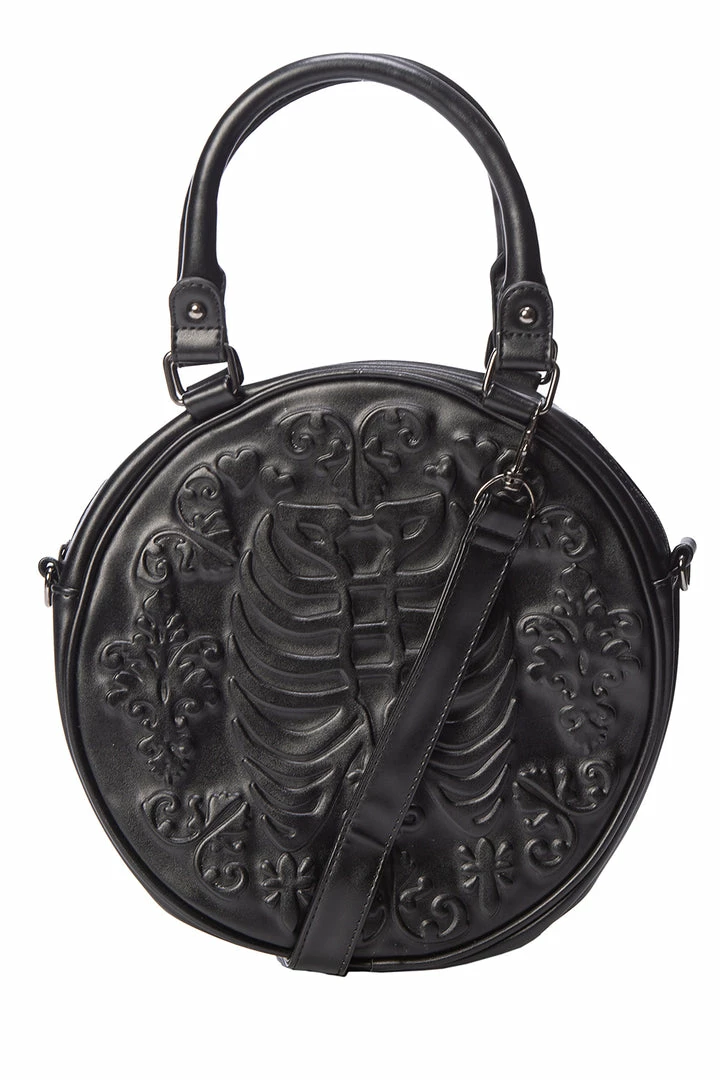 Named after one of our favourite characters from Buffy the Vampire Slayer! The Banned round shoulder bag is embossed with rococo floral detail and a pair of ribs. Top zip fastening. 100% vegan.