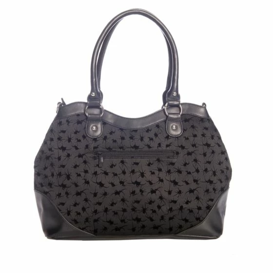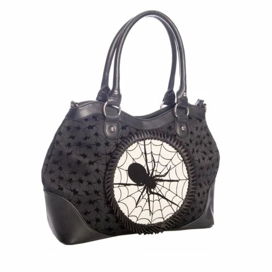 Black handbag featuring spiders in a flocking print and a spider in its web cameo.