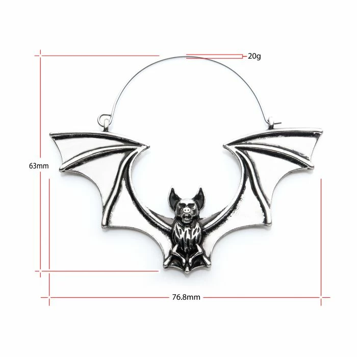 20g Stainless Steel Post with Zinc Alloy Silver Burnished Flying Vampire Bat Plug Hoops. Sold as Pair. Dimension: 76.8mm (L) x 63mm (W)