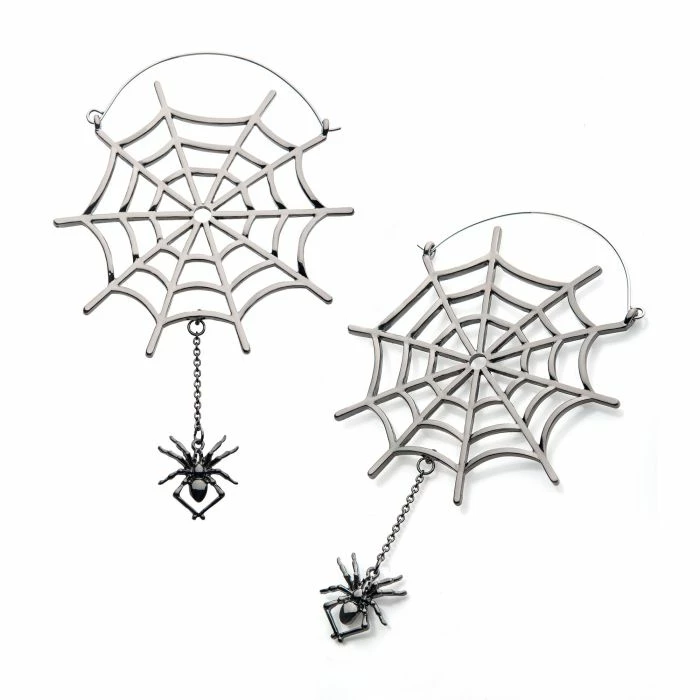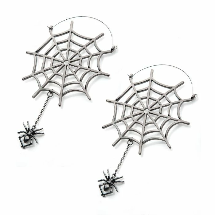 20g Stainless Steel with Silver Plated Spider Web and Dangling Spider Plug Hoops.