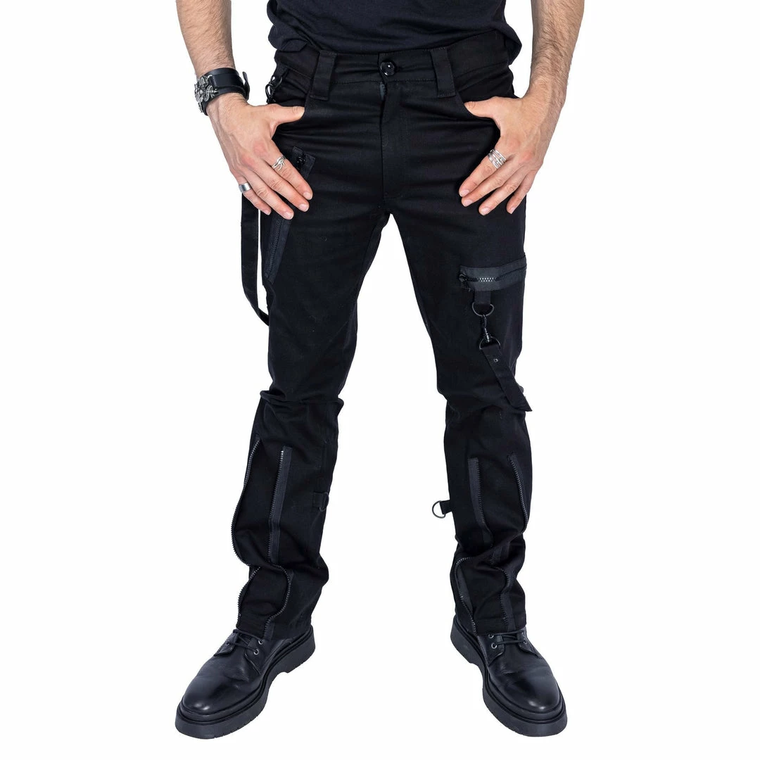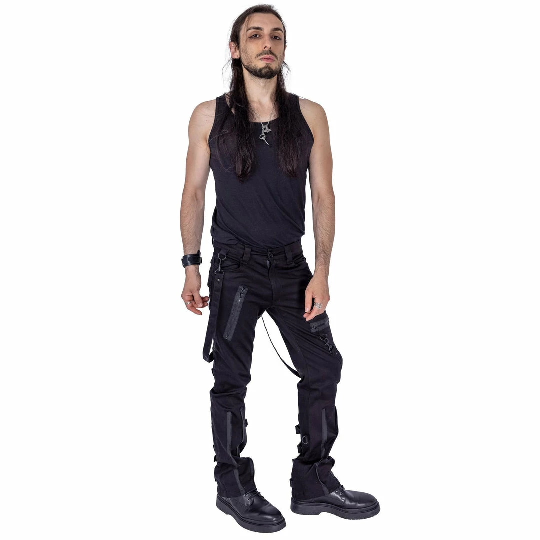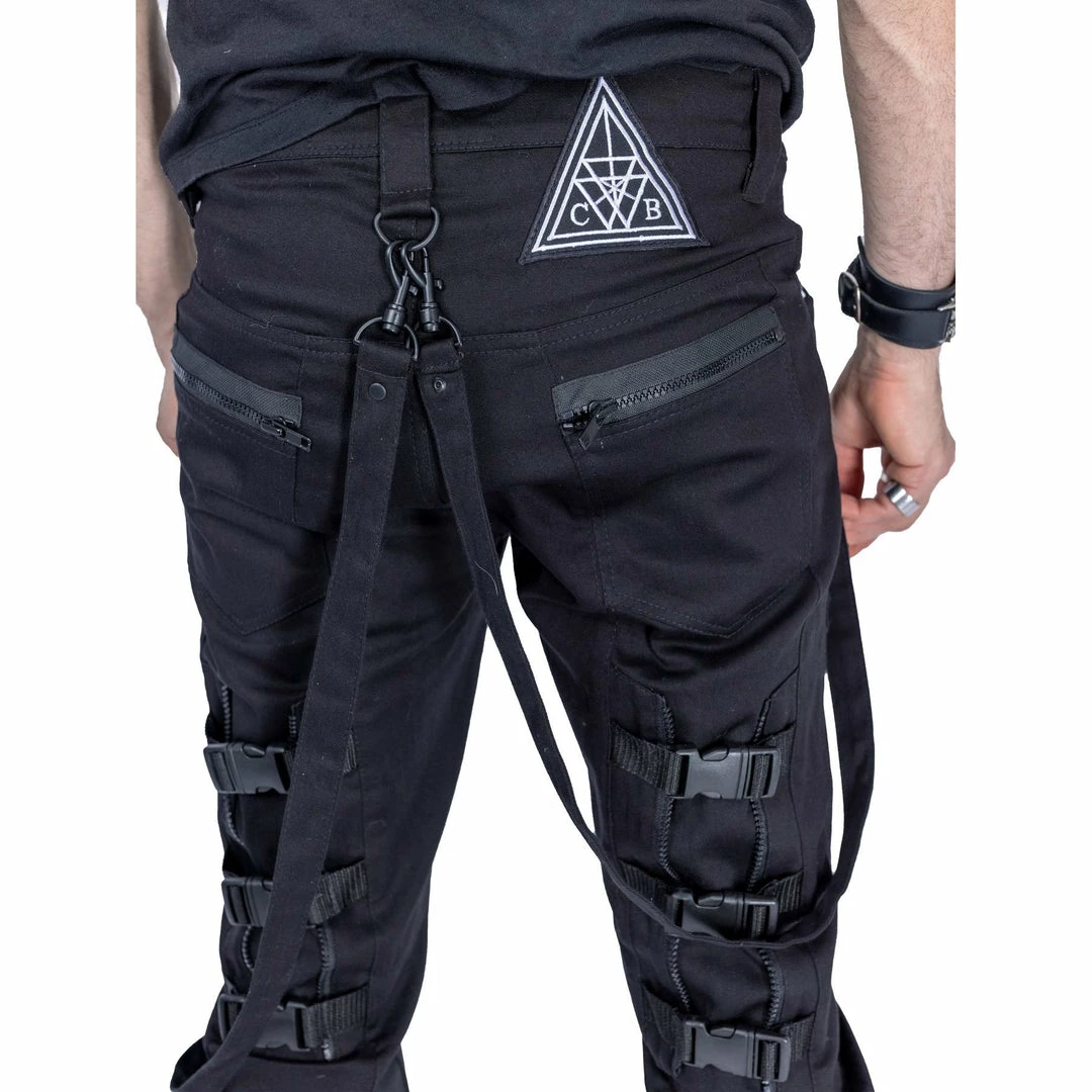 The Diego Pants by Chemical Black are slim fit pants with black straps, zipper accents, and clips on the back of the legs and detachable straps.