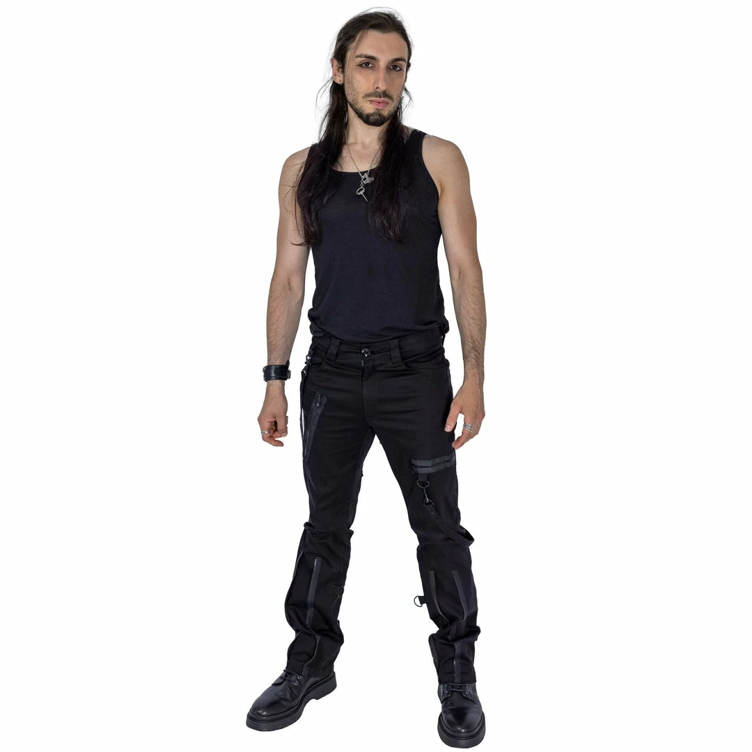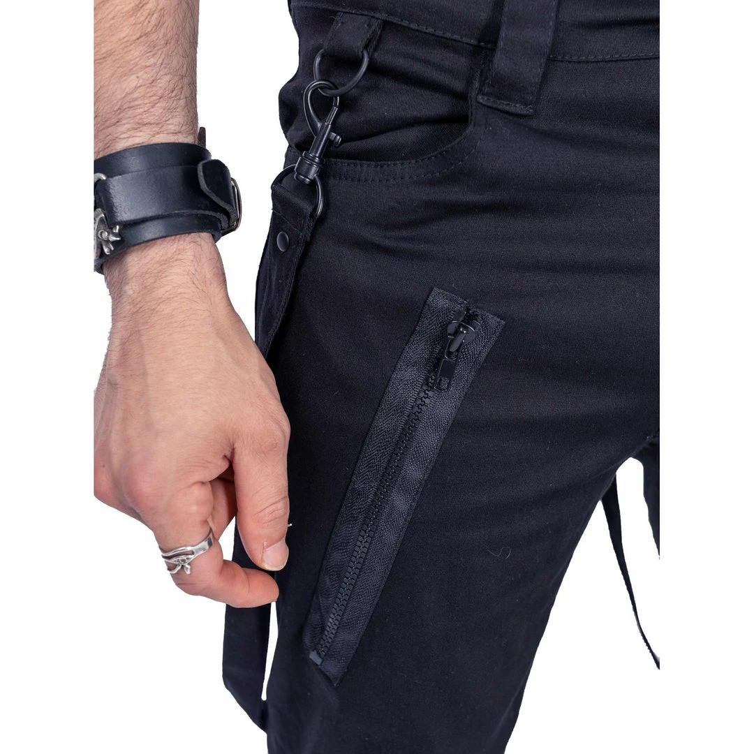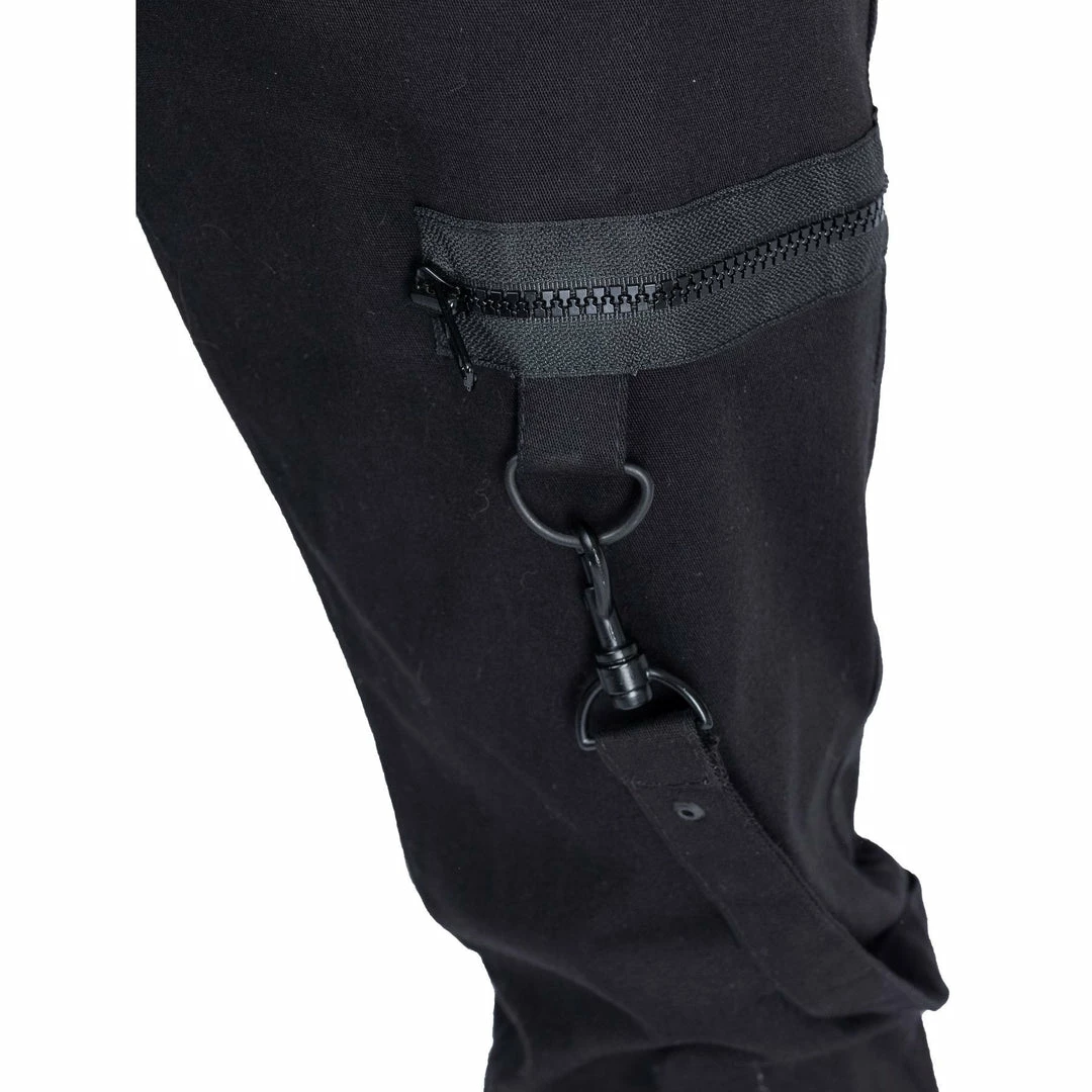 The Diego Pants by Chemical Black are slim fit pants with black straps, zipper accents, and clips on the back of the legs and detachable straps.