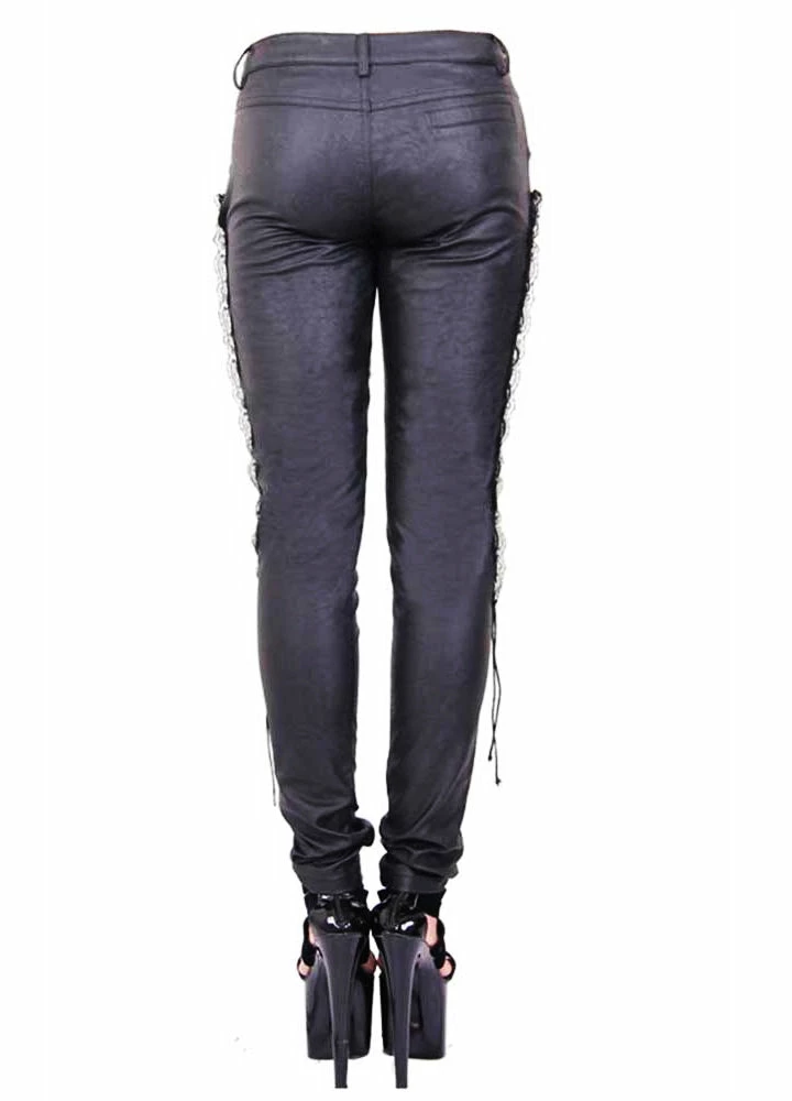 Awesome Gothic trousers from Devil Fashion. These gorgeous leather trousers feature a subtle baroque style design with black lace running down the side of each leg. As well as lace details, these trousers also include corset style lacing running down the sides adding an extra touch of Trad Goth to the look. Made from 60% Cotton and 40% Leather, these figure hugging trousers have a fair bit of stretch to them. The inseam of these trousers measures 30.5″ with a total length of 38″.