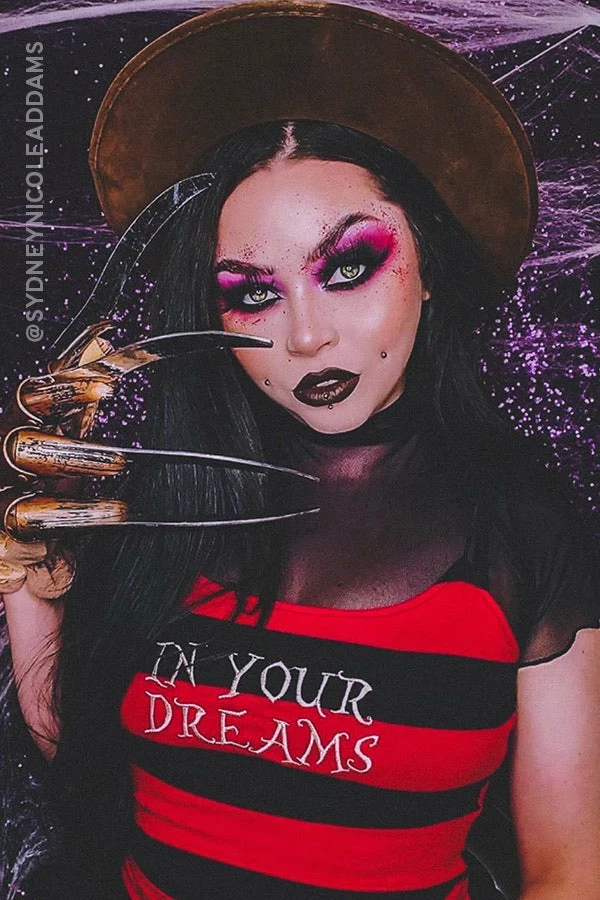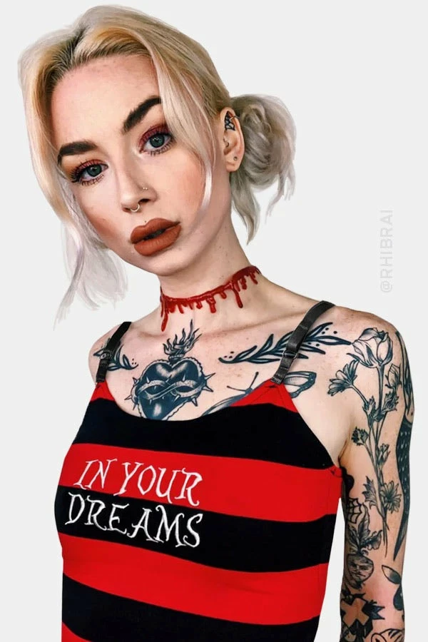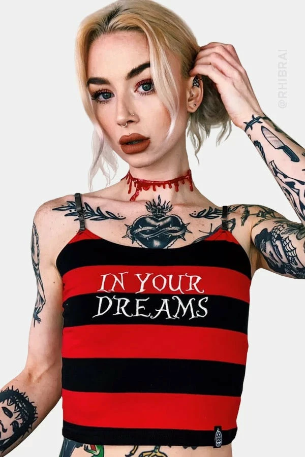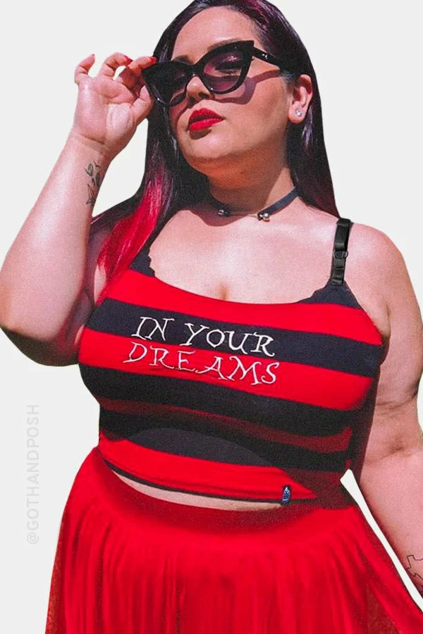 In your Dreams baby. If you love all things spooky this is for you. This super cute cropped black and red striped top has just the right amount of stretch for a perfect fit. It features embroidered “In Your Dreams” detail and a cute little spooky branded tag in the bottom right corner.