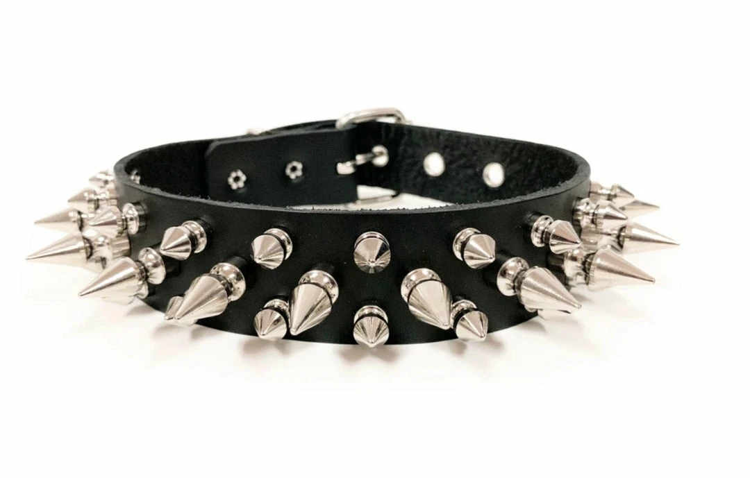 1 1/8″ BLACK LEATHER CHOKER WITH 1/2″ & 1″ SPIKES