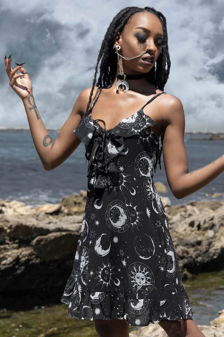 Dreamy and seductive, the ‘Astral Light’ sundress is your perfect partner for dusk or dawn. In a soft-flowy chiffon fabric for perfect comfort and fit. Featuring an open neck with thin shoulder straps, lace-up front detail and zipped back for easy on/off. Adorned with a contrasting sun & moon pattern. Versatile and easy to style – fully lined of course.
