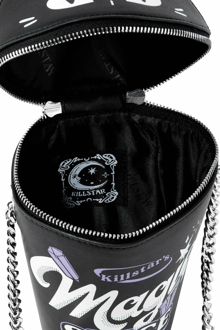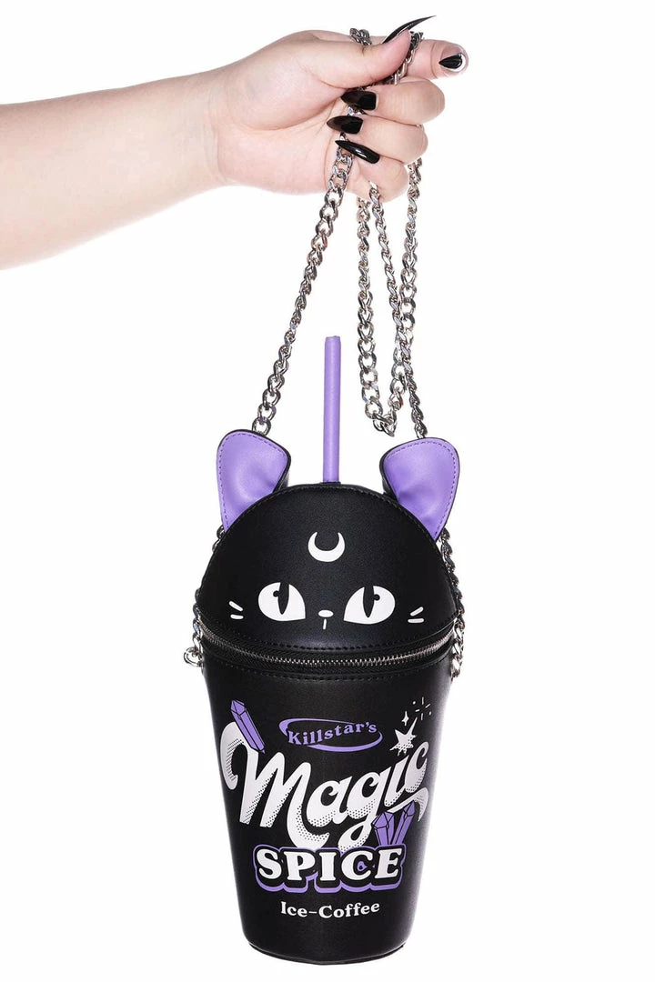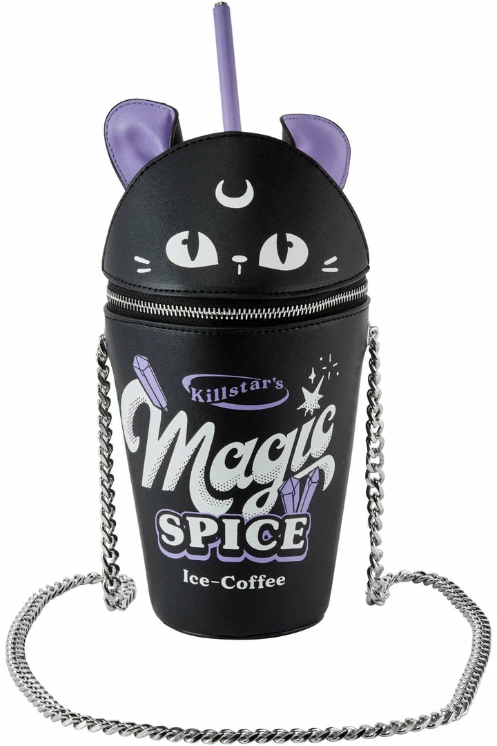 Show the world your magic – the ‘Magic Spice’ handbag mimics the shape of yer fav cold brew, printed motif to front and long chain strap. With zip closure – fits all yer essentials, perfect for nights out, shoots or just hanging with yer coven!