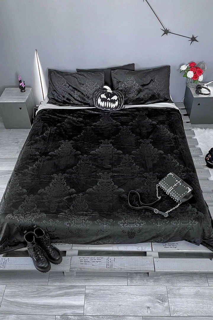Complete your dream crypt with the luxurious ‘Daemon’ blanket. Made from extra soft fabric and with black-on-black print. Large size – perfect to adorn your [double] bed or getting real-cozy on the sofa.