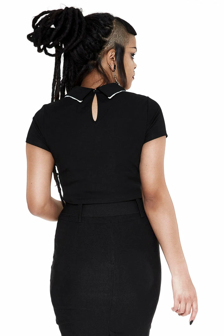 Look super cute in the ‘Dead Dawn’ crop top; conjured using a super-soft jersey which stretches to perfection for a flattering yet comfortable fit. Features a high statement collar, contrasting trim, and skull and bones embroidery – no detail has been spared! This lil staple piece is a dream to style and looks great with all yer fav lookz! Purrrfect for a day out with yer Coven or picnics by the moon!