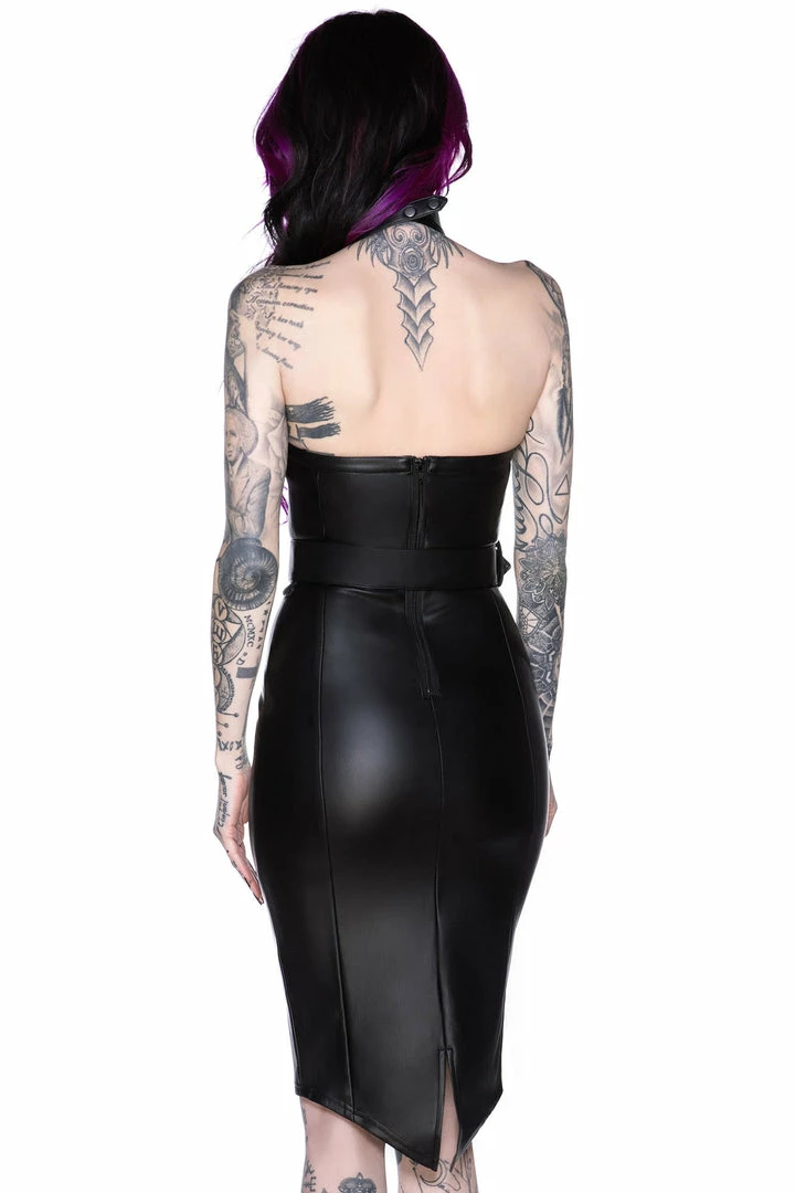 Listen to them, the children of the night – what music they make! Channel some serious powerful vamp vibes in our ‘Eclipse’ pencil dress; conjured using a luxe faux-leather which stretches to perfection for a body huggin’ fit that would make even Dracula look twice! Complete with deadly details – seductive low neckline + halterneck, bat-accents and waist belt. You’ll be ready to slay the night in this statement piece – purrfect for dark dates by the moon or decadent parties in yer castle!