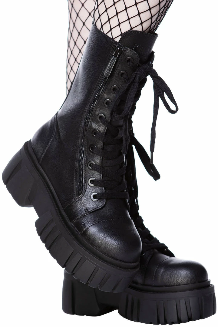 Make ’em look twice with envy with the ‘ Kick the Bucket’ boots. In faux leather with lace-up front – featuring a chunky sole. Great for adding some serious attitude for yer day-to-day adventures out the crypt or causing havoc at night!