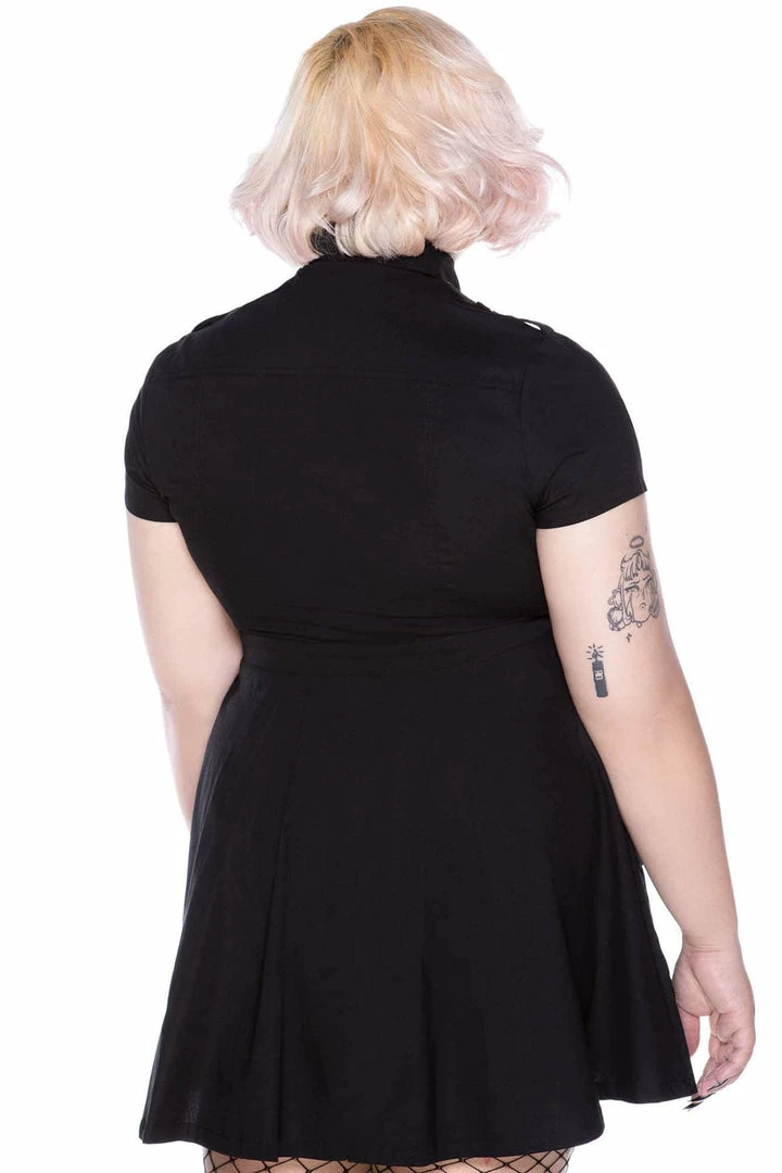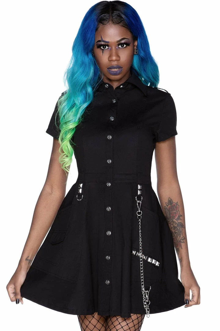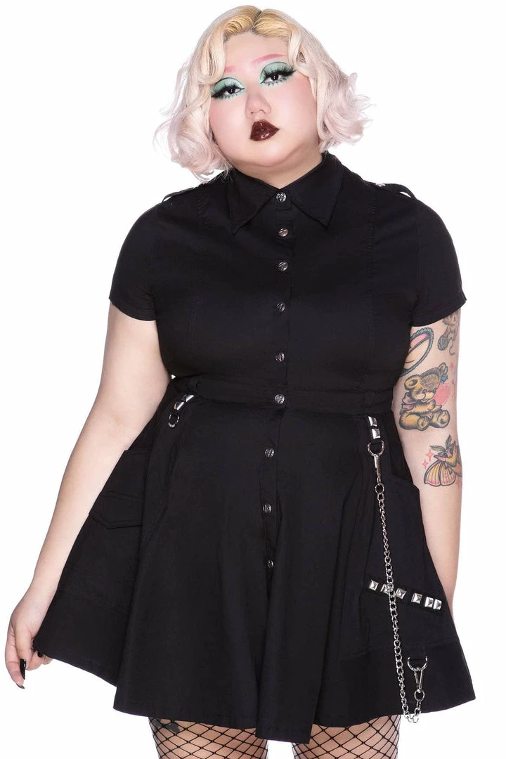 Don’t let the fear of what could happen make nothing happen. Look good enough to make heads roll in the ‘Breach The Peace’ dress; conjured using a luxe soft-touch fabric which stretches to perfection for a comfortable yet flattering fit. Features lapel collar detail, detachable chain, short sleeves and button-up front. The perfect lil gothic dress- a dream to style! Looks great dressed up or down depending on yer mood/moon!