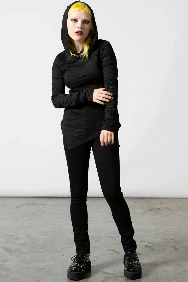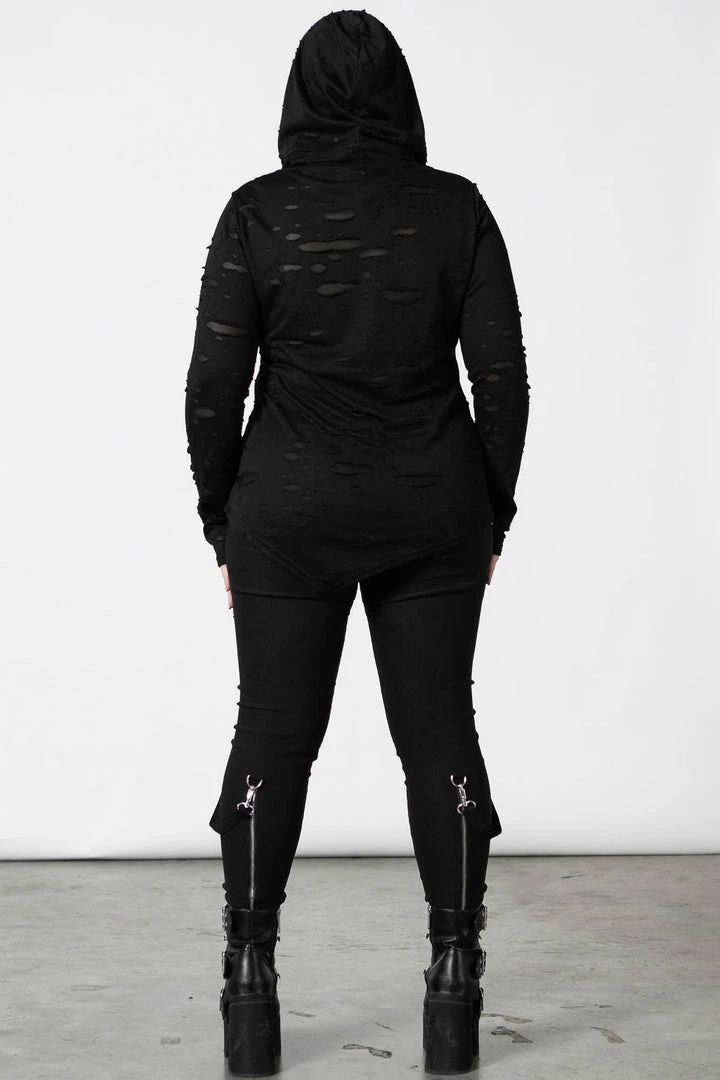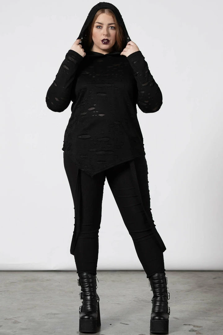 Ready to chill/thrill/kill any hour of the day with our ‘Infernia’ hooded top. Super-soft fabric with just the right amount of stretch, large hood, lace-up detail on the chest, long bell sleeves and buckle accents. An essential piece – easy to wear and goes with anything!