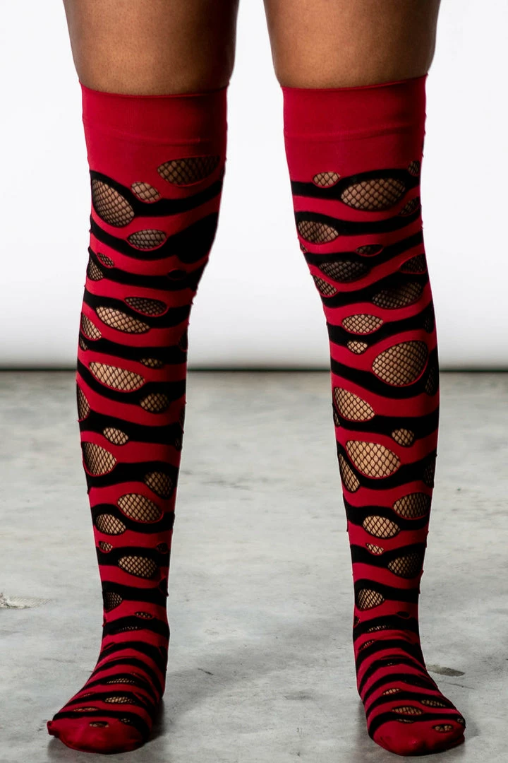 When all else fails, get new socks! Classic and exxxtra long socks – ‘Wretched Soul’ distress socks featuring contrast stripes and thigh-high look. With distressed details all over.
