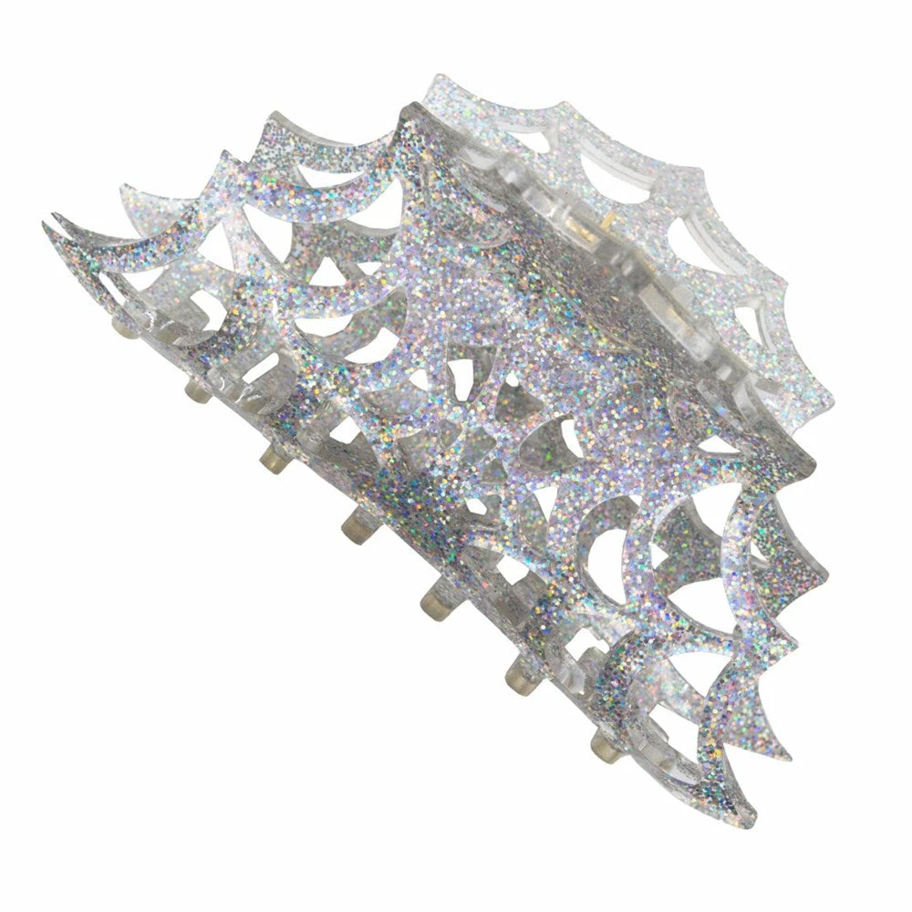 Kreepsville Spiderweb Hair Claw Clip Silver. Put some scare in your hair with our eye-catching, super sturdy spring claw clips. Perfect for up do’s and lazy hair days! Made with shiny holographic acrylic. Designed by ghouls in the USA! Clip size: 4.5″ (11.43cm) x 2″ (5cm).