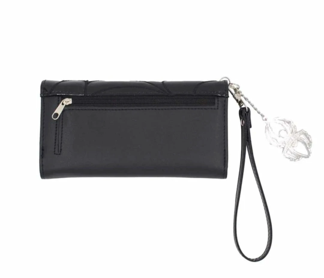 Get caught in Elvira’s web with this officially licensed Elvira Macabre Mobile Black Edition Wallet. Wallet features an embroidered black web design on black vinyl. It has 3 inside sections, an ID holder, 14 card spaces, a coin section in the back, a detachable spider chain, a wristlet and a double snap closure to widen space if needed.