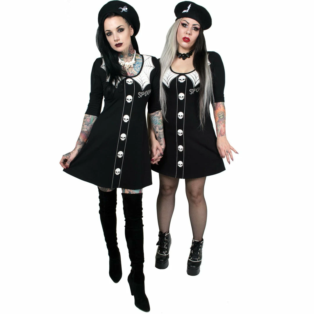 Kreepsville 666 Spooky Girl flare dress, this super cute 95% cotton 5% spandex flared dress with 3/4 length sleeve and scoop neck detail.