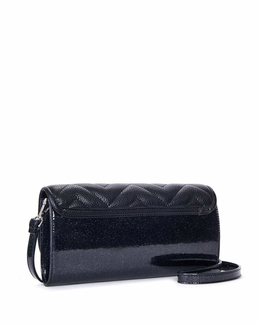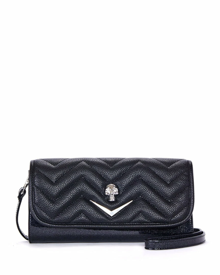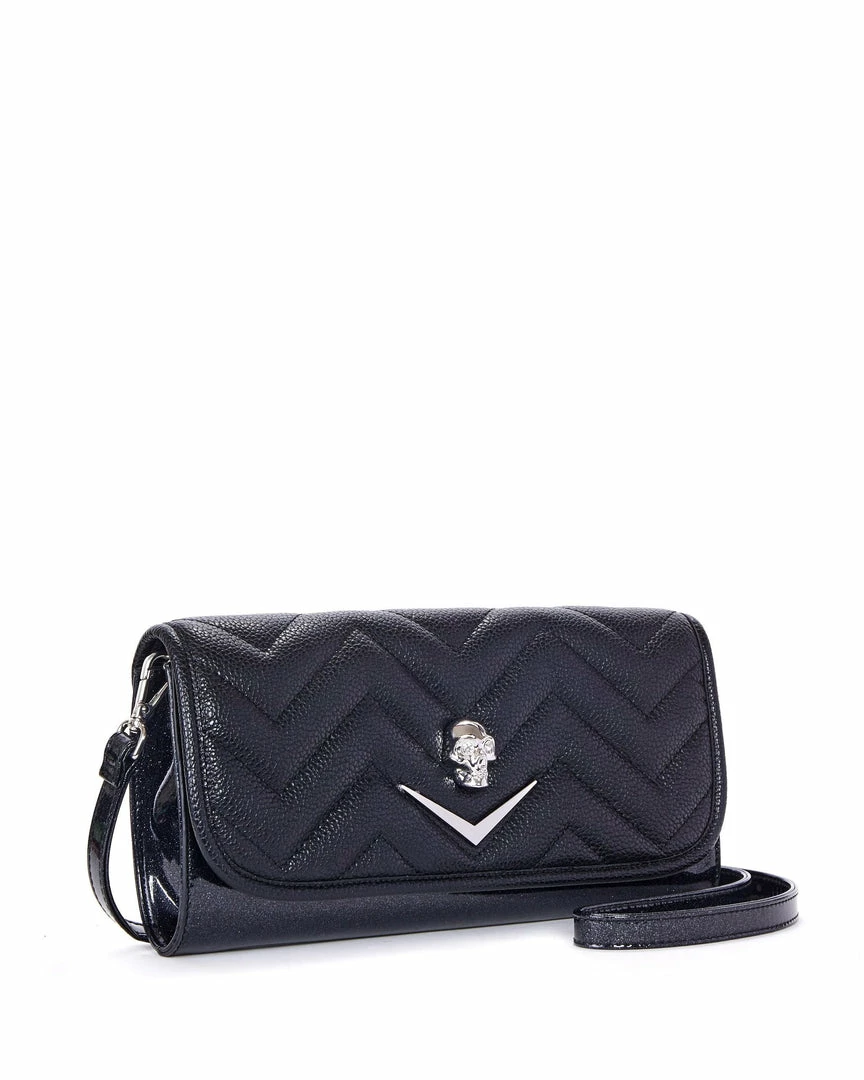 Our new Mini Hellraiser Totes are deliciously dark. They feature our all over chevron stitching and our skull and chevron hardware. Inside is lined with black on black leopard with a zipper closure pocket and silver bullet feet on the bottom. Also comes with a detachable and adjustable crossbody strap and also can be worn as a clutch. Just enough room for all your spooky essentials.