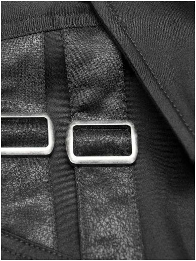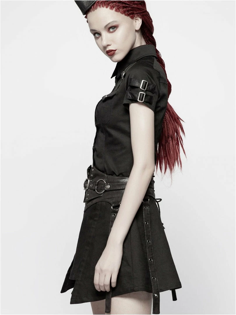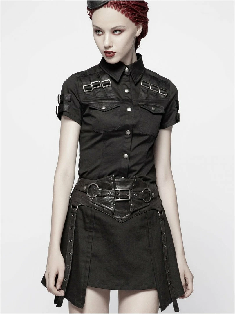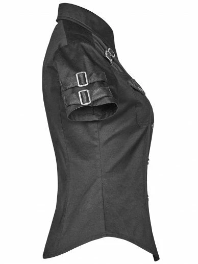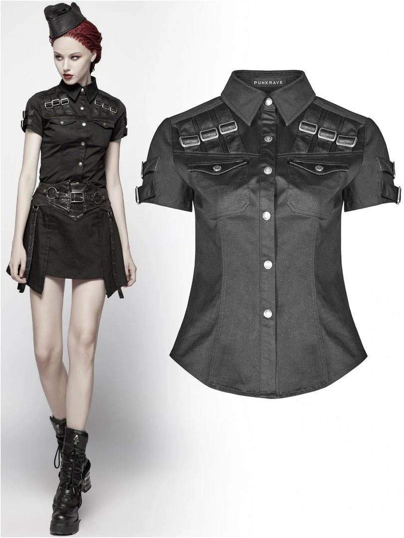 Gothic Militia shirt by Punk Rave. Gothic Military style women’s black short-sleeved shirt decorated with synthetic leather imitating fabric buckled straps on the chest and sleeves. Press studded front closure.