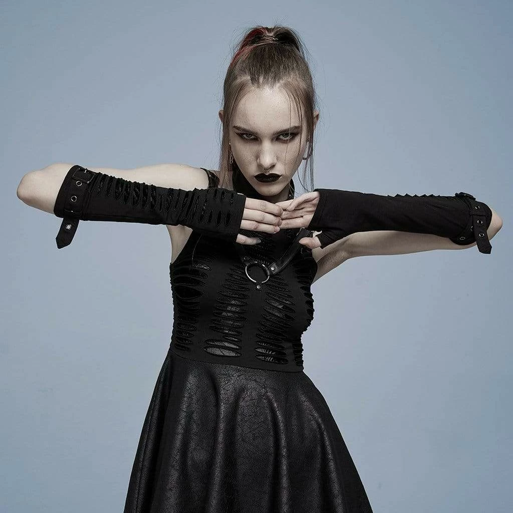 Black ripped mesh finger-less gloves/arm warmers with buckles.