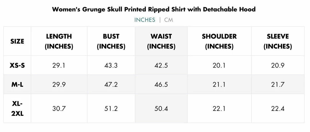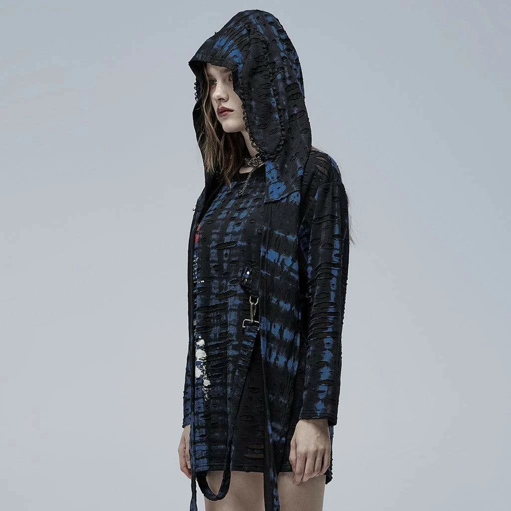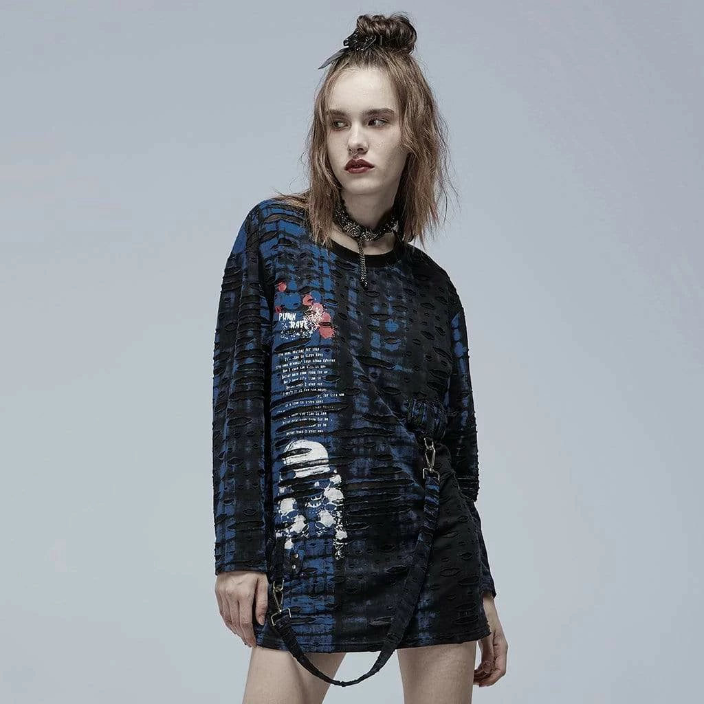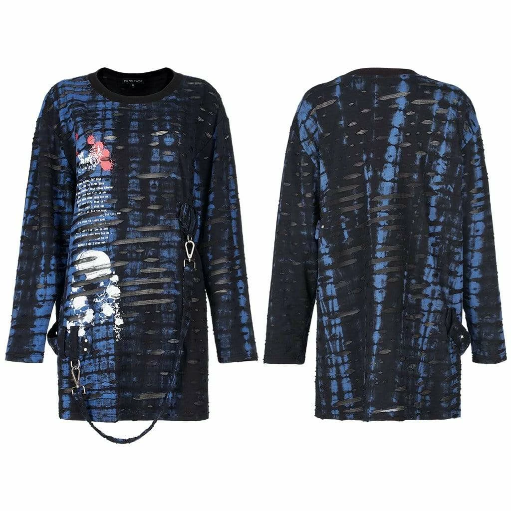 Black and blue, layered ripped shirt with detachable hood, screen-printed skull, and detachable strap.