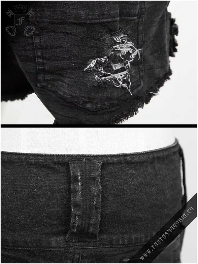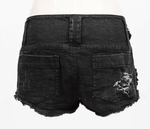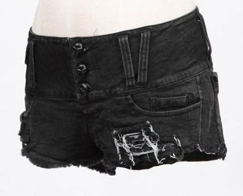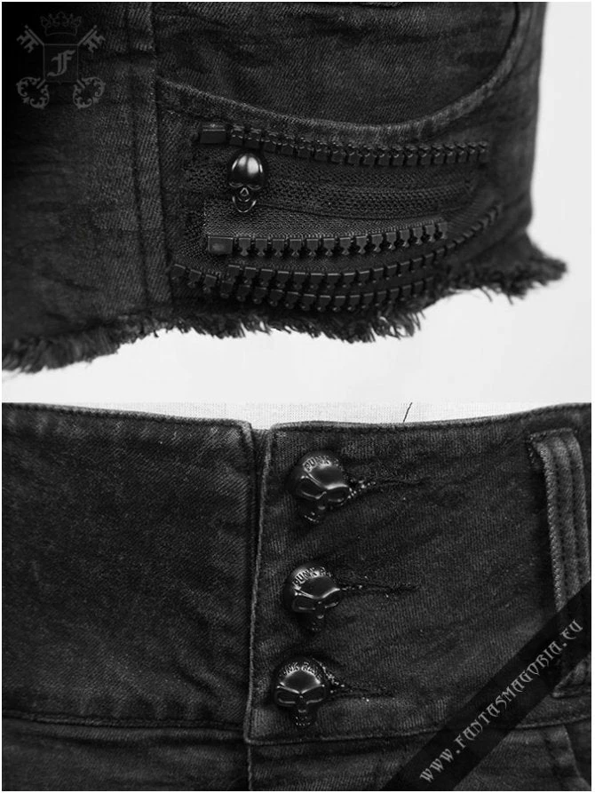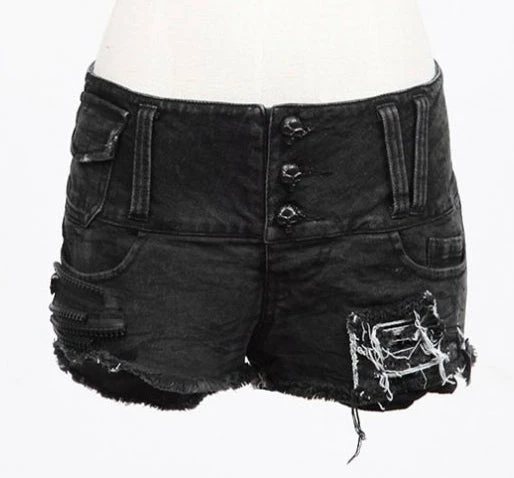 Gothic Punk style women’s black distressed denim mini shorts.