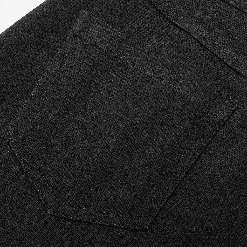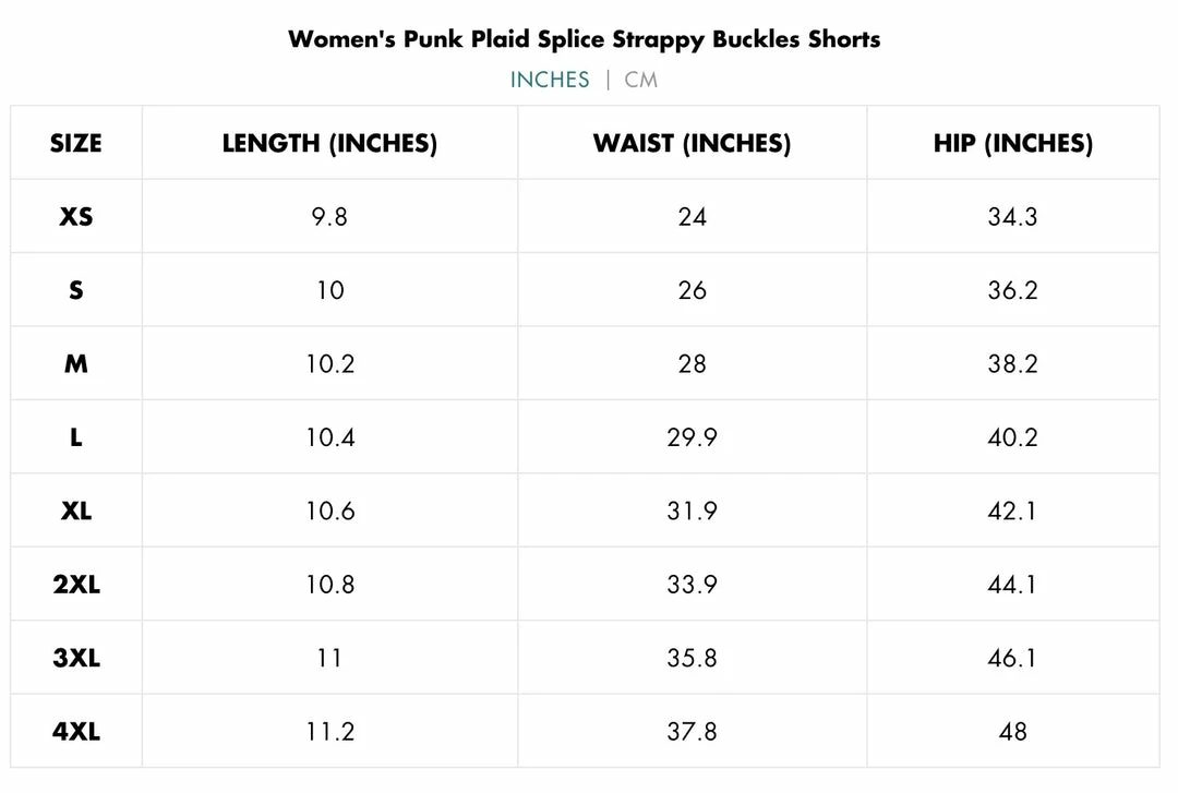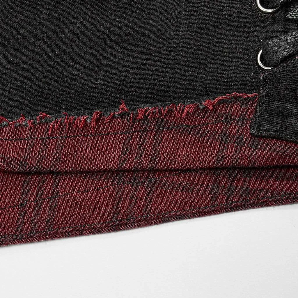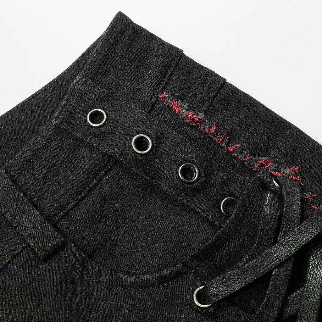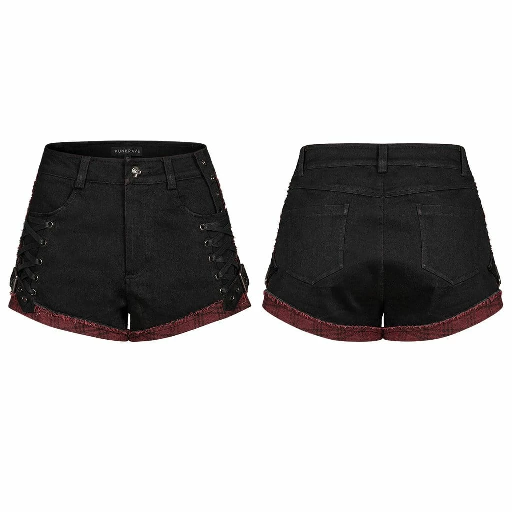 Black and red, stretch denim shorts with straps, buckles and lacing up the sides.