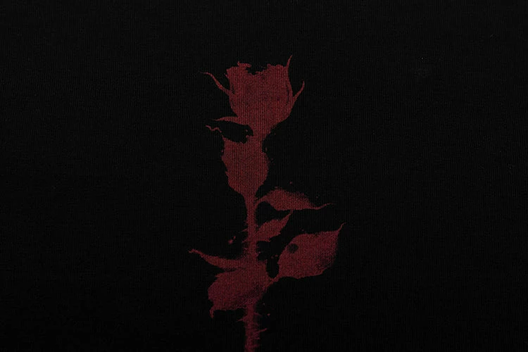 Bramble Roses T-Shirt with U-shaped thin collar and Inverted rose print and cut-out sleeve.