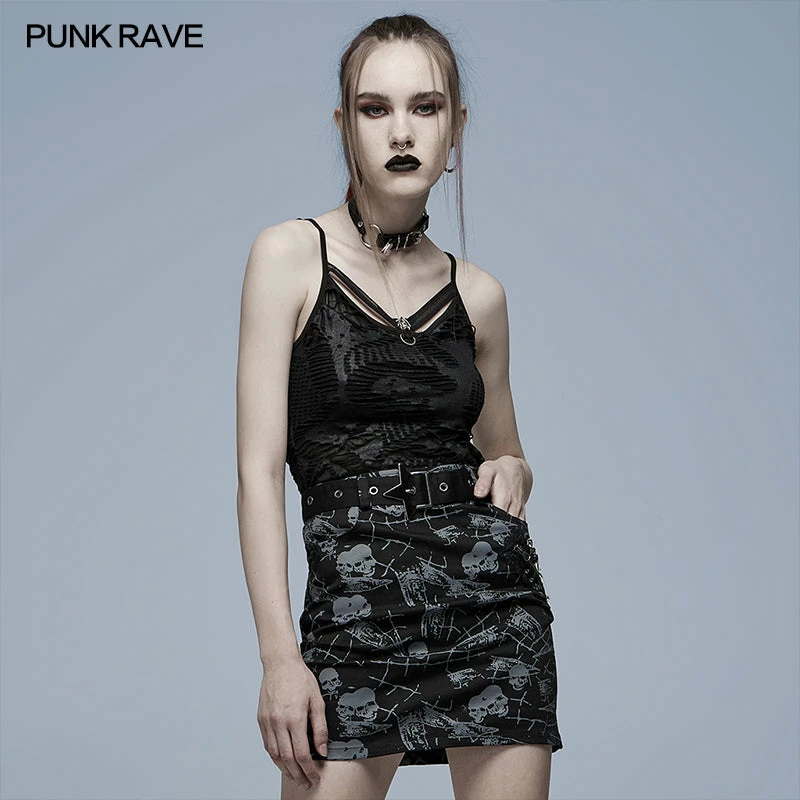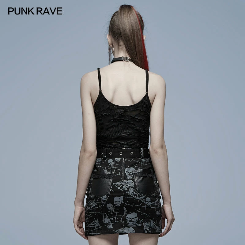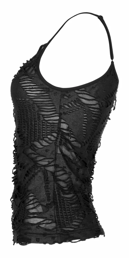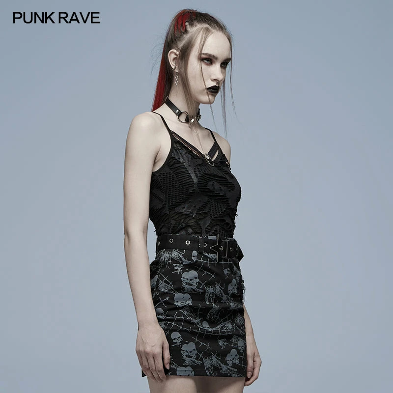 Black camisole tank top from Punk Rave. Textured, ripped top is made from a soft elastic fabric featuring skull accent on the front and adjustable shoulder straps.