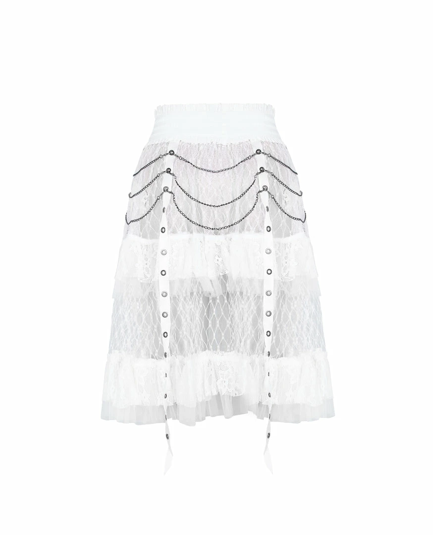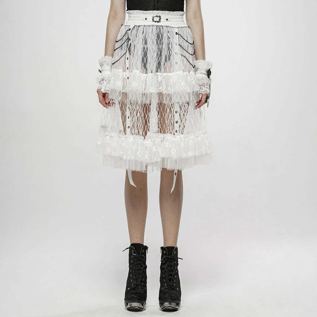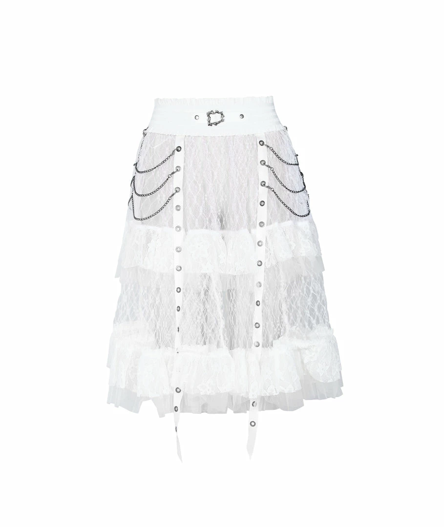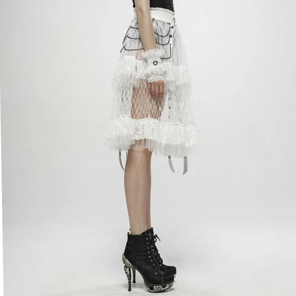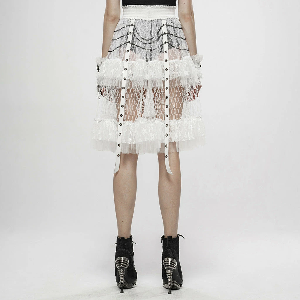 A long, high-waisted, multilayered mesh skirt by Punk Rave. Features wide mesh with ruffle, chains, and strap accents.