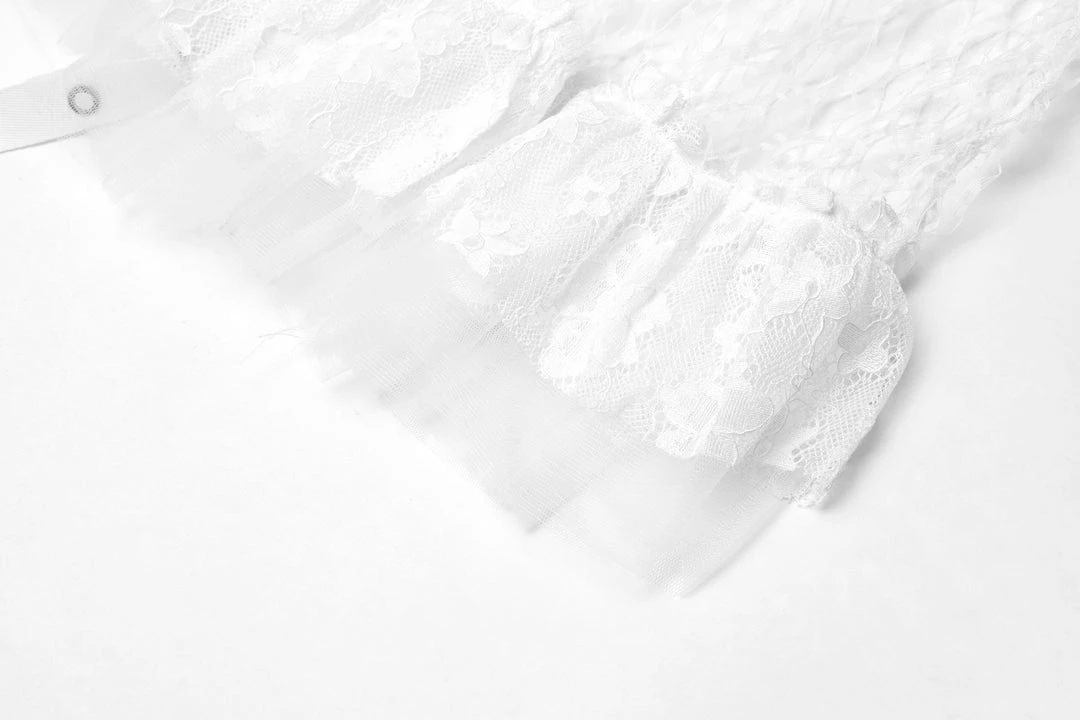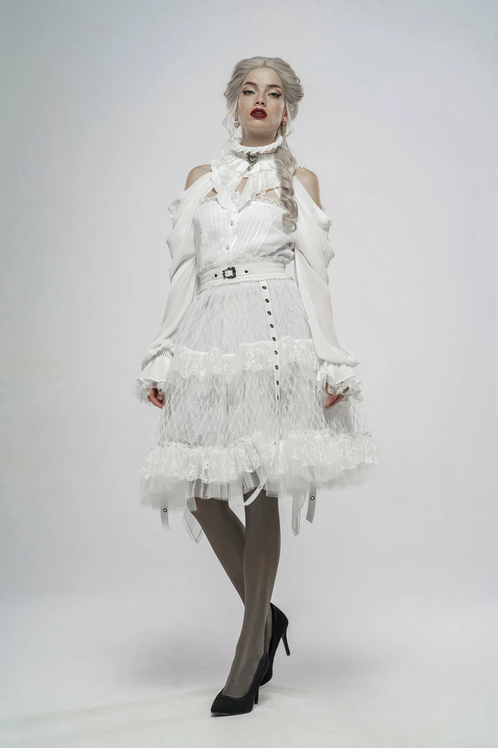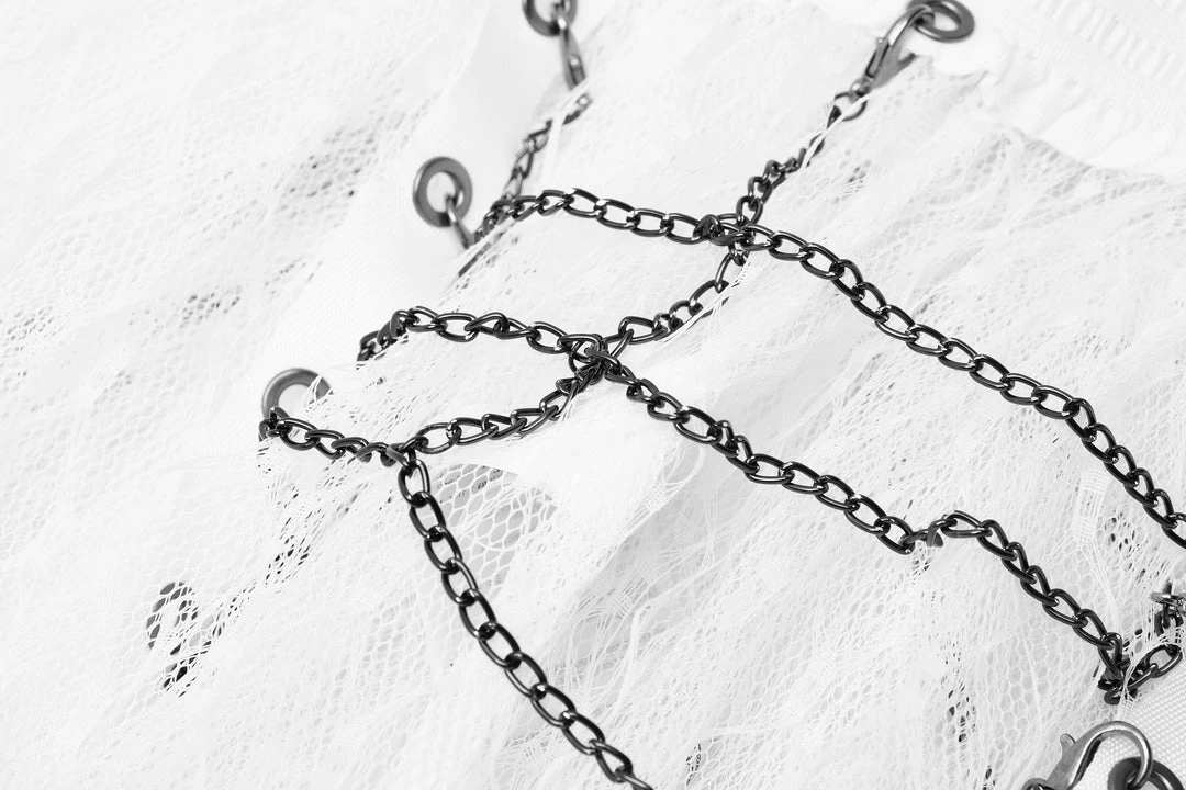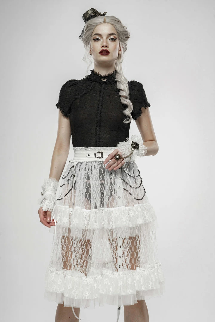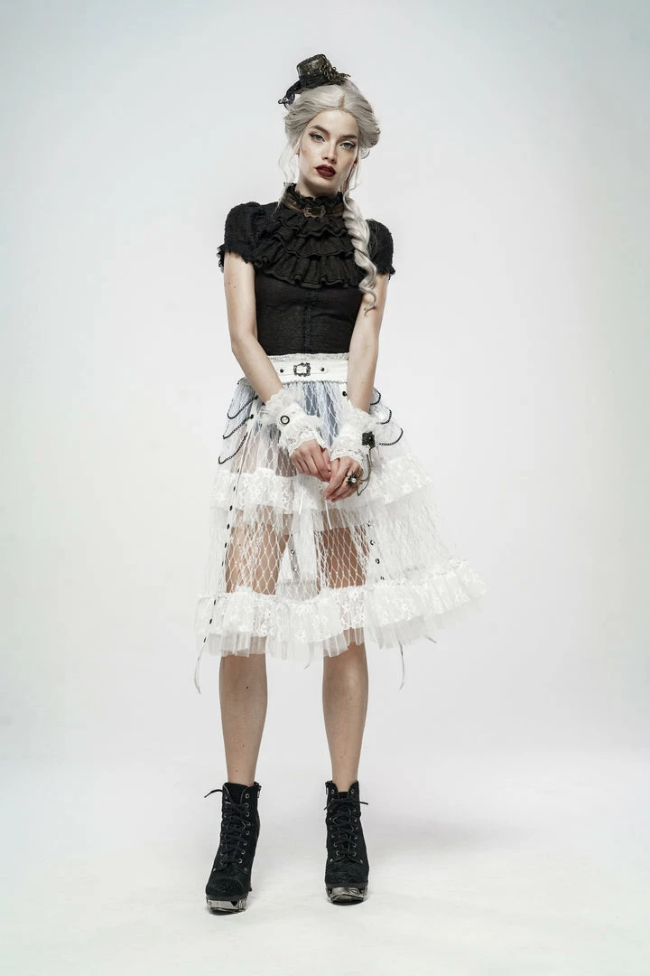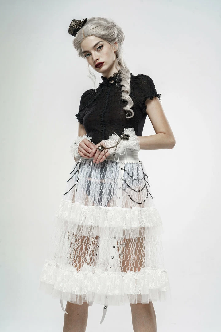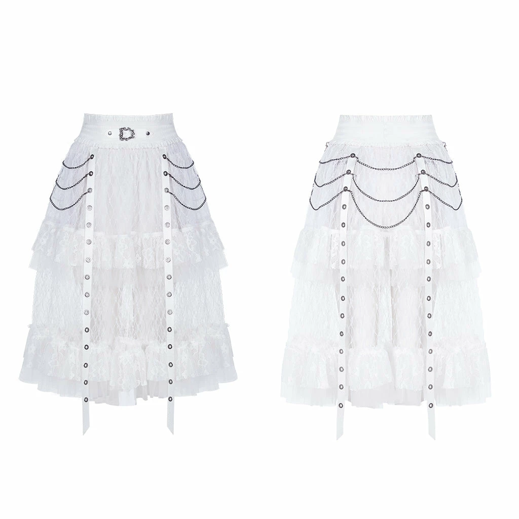 A long, high-waisted, multilayered mesh skirt by Punk Rave. Features wide mesh with ruffle, chains, and strap accents.