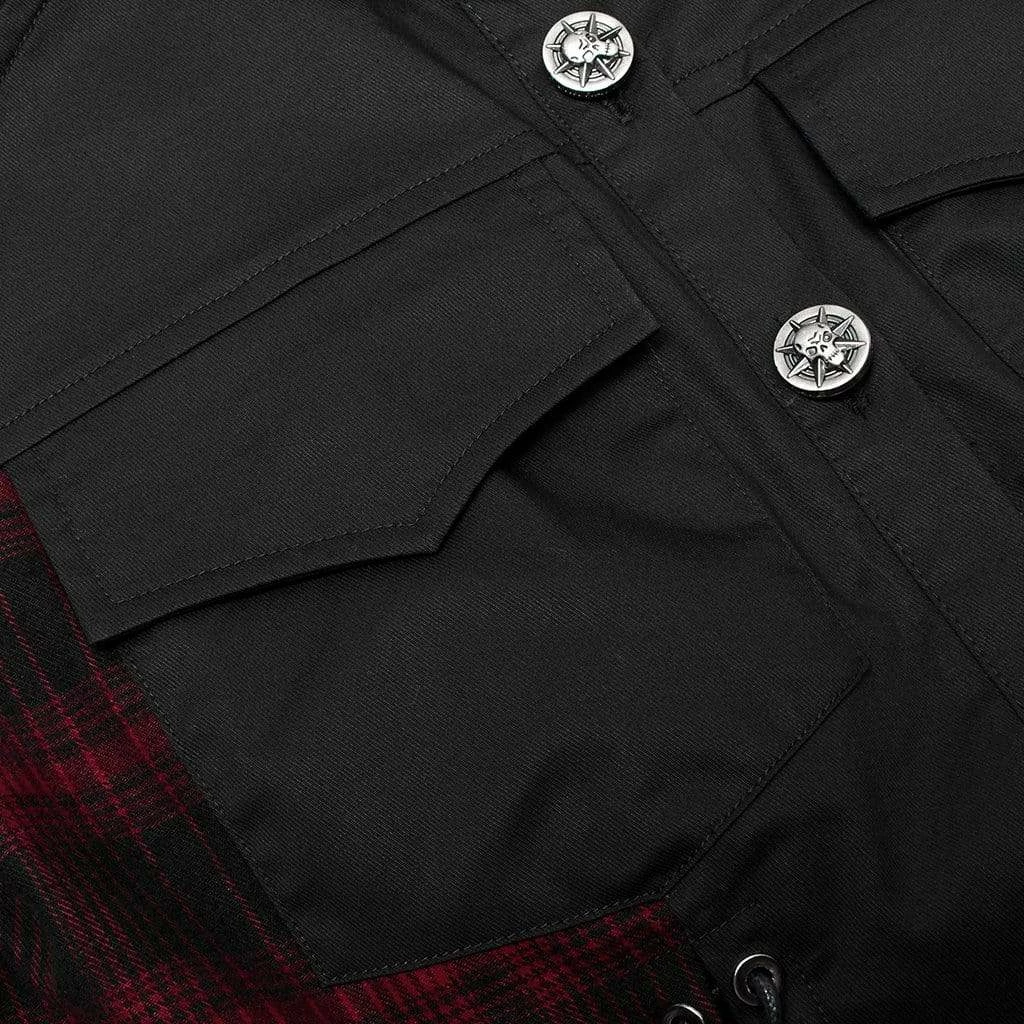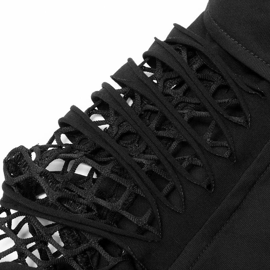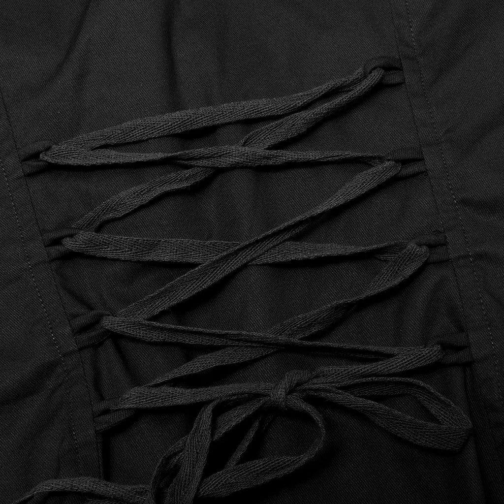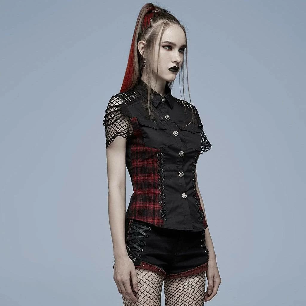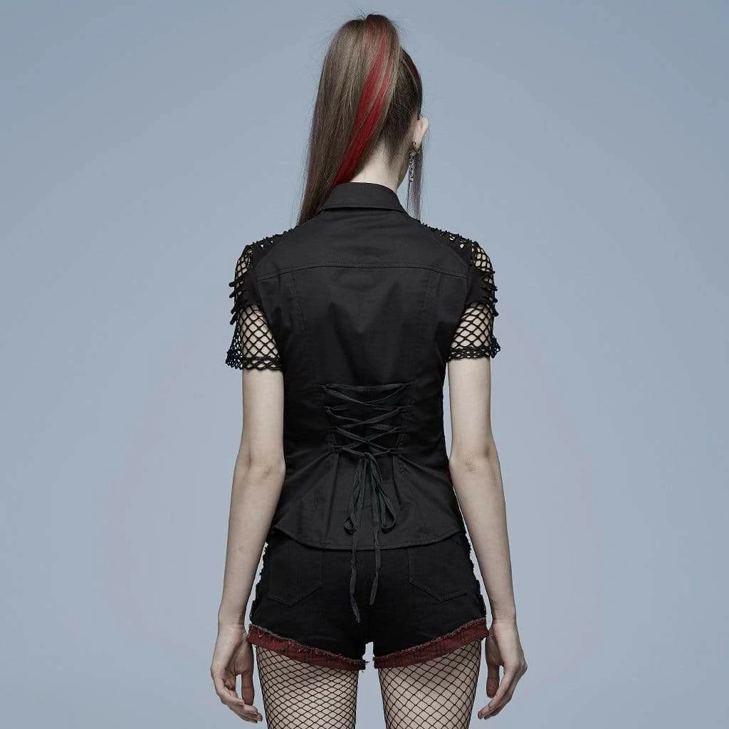 Black and red top with shredded mesh short sleeves, lacing up the front and back, and skull buttons. Fitted, stretch material.