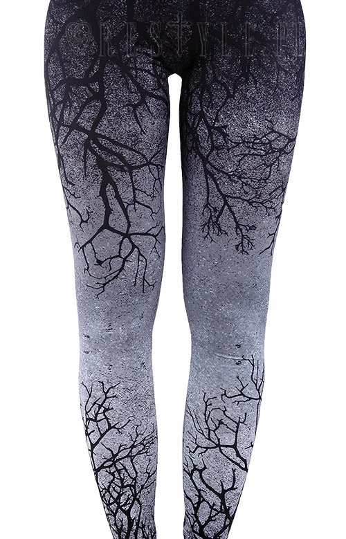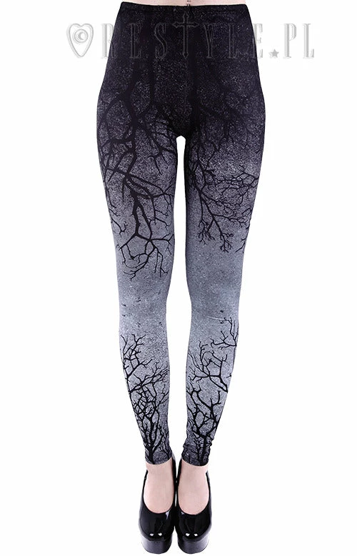 Leggings with printed tree branches on gradient background. Made of stretchy, very soft fabric, perfectly fit to the body (92% polyester, 8% spandex).