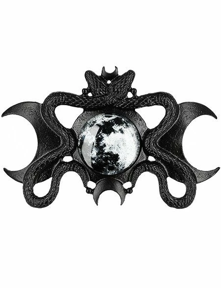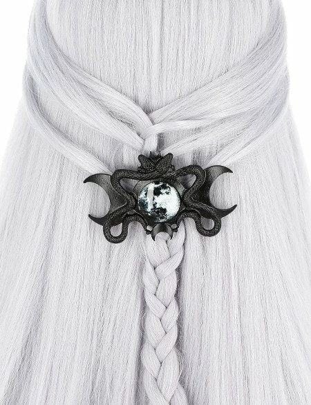 In the center there is full moon printing under enlarging glass cabochon. All embraced with two black snakes. On sides there are black crescent moons. Hairclip has easy and durable closing.