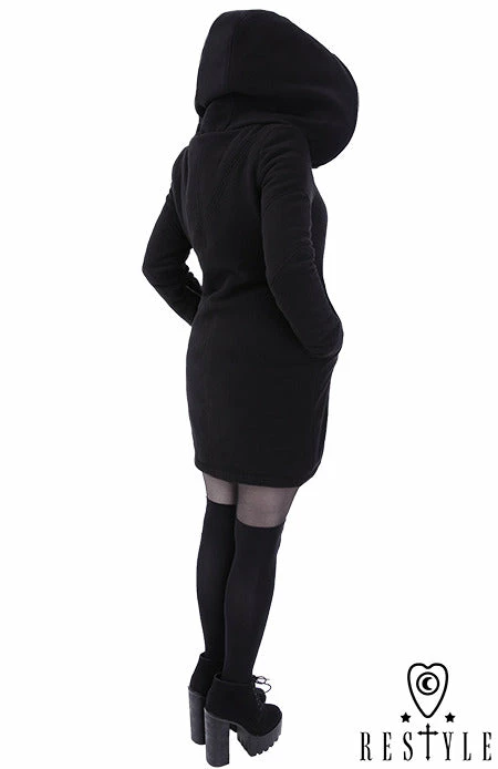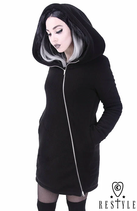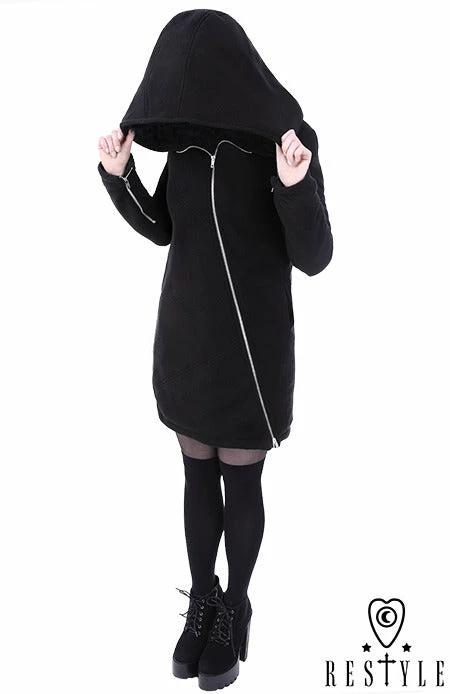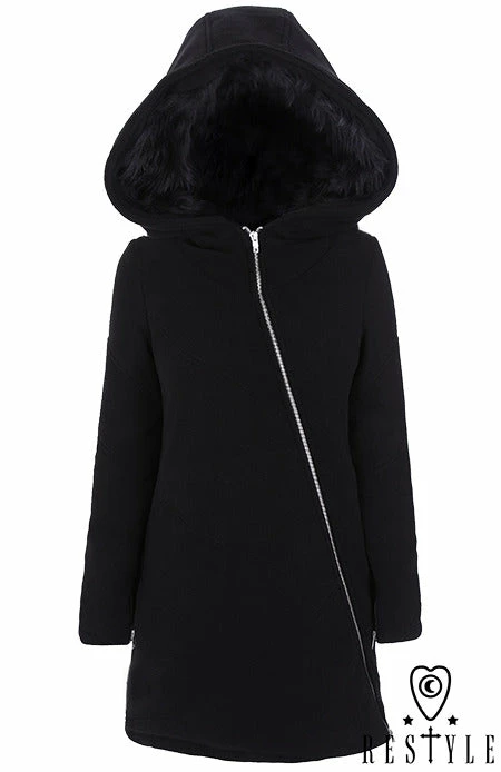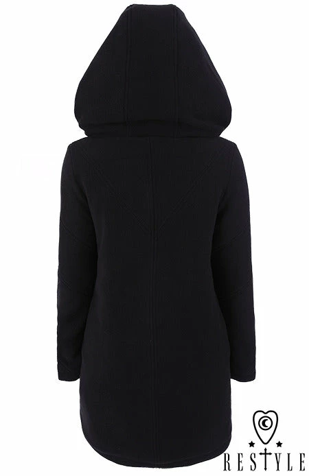 Black winter jacket with pockets, huge hood. Oversize style with side pockets This great for every body type coat is made of very thick, black fleece. Jacket is fully warmed with polyfill 100g, great for winter weather without feeling “puffy”. Metal zipper closing is placed asymmetrically.