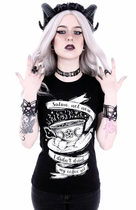 Blouse made of strong, black cotton. Slim fitted with a classic neckline. On the center there is a big print of black coffee in the gothic cup with an inscription: “Satan not now, I didn’t drink my coffee yet!”