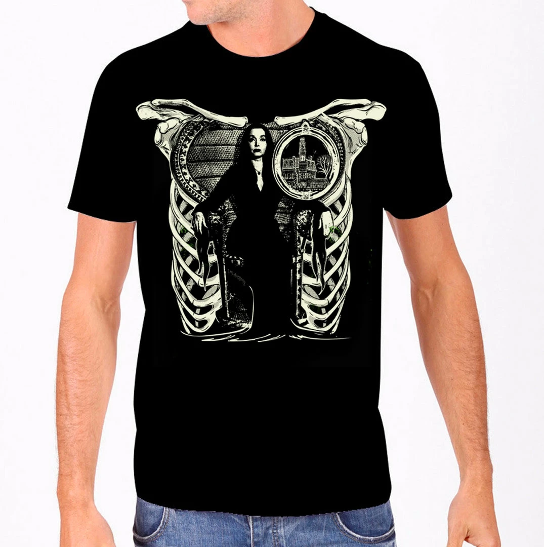 Morticia Addams t-shirt with high-quality graphic printed on slightly fitted sturdy but breathable material. This graphic is owned by Rock Rebel only!