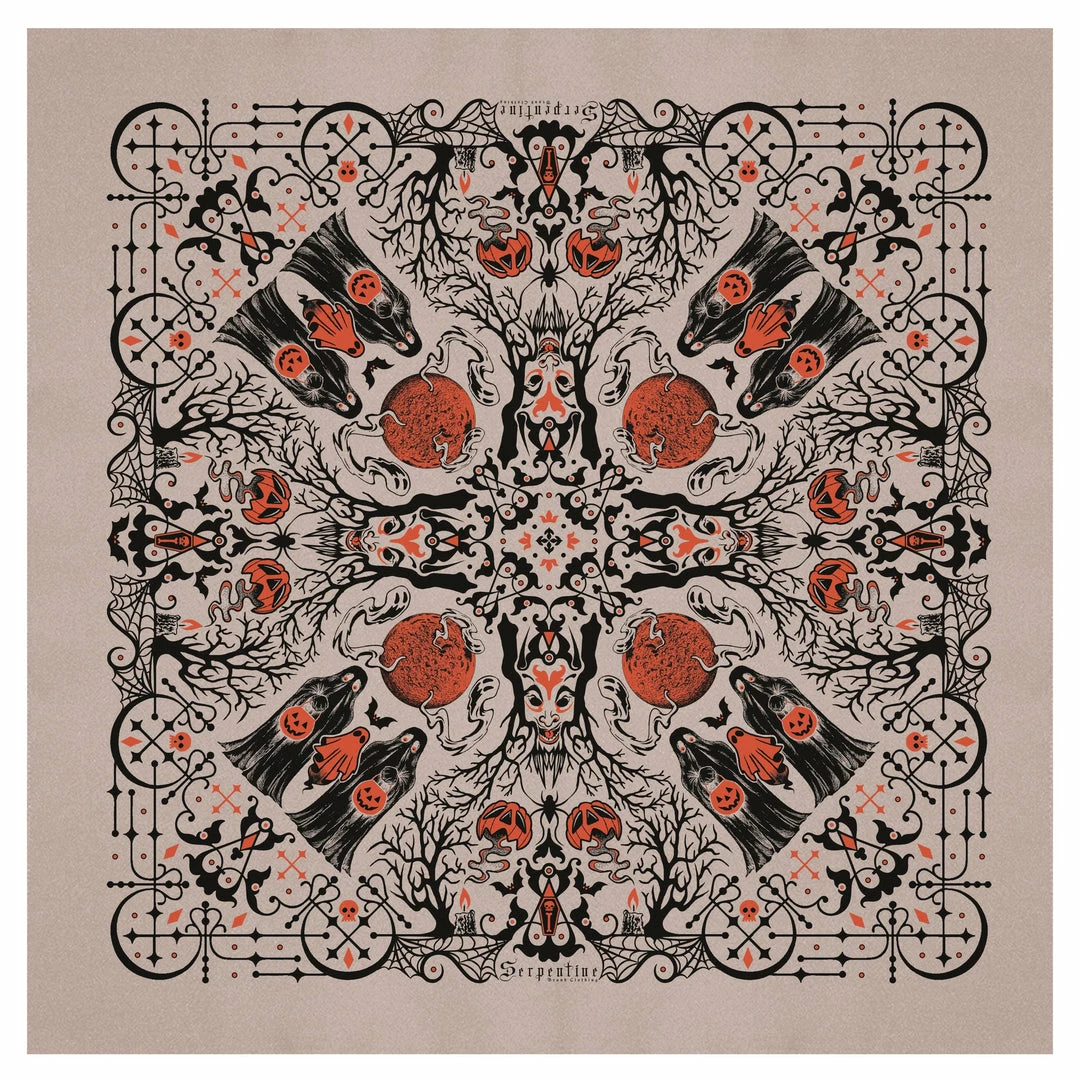 Tricks & Treats Bandana is Vintage Rust Orange and Black on a Beige bandana. Designed diagonally so once it’s folded and tied it will display at it’s very best.