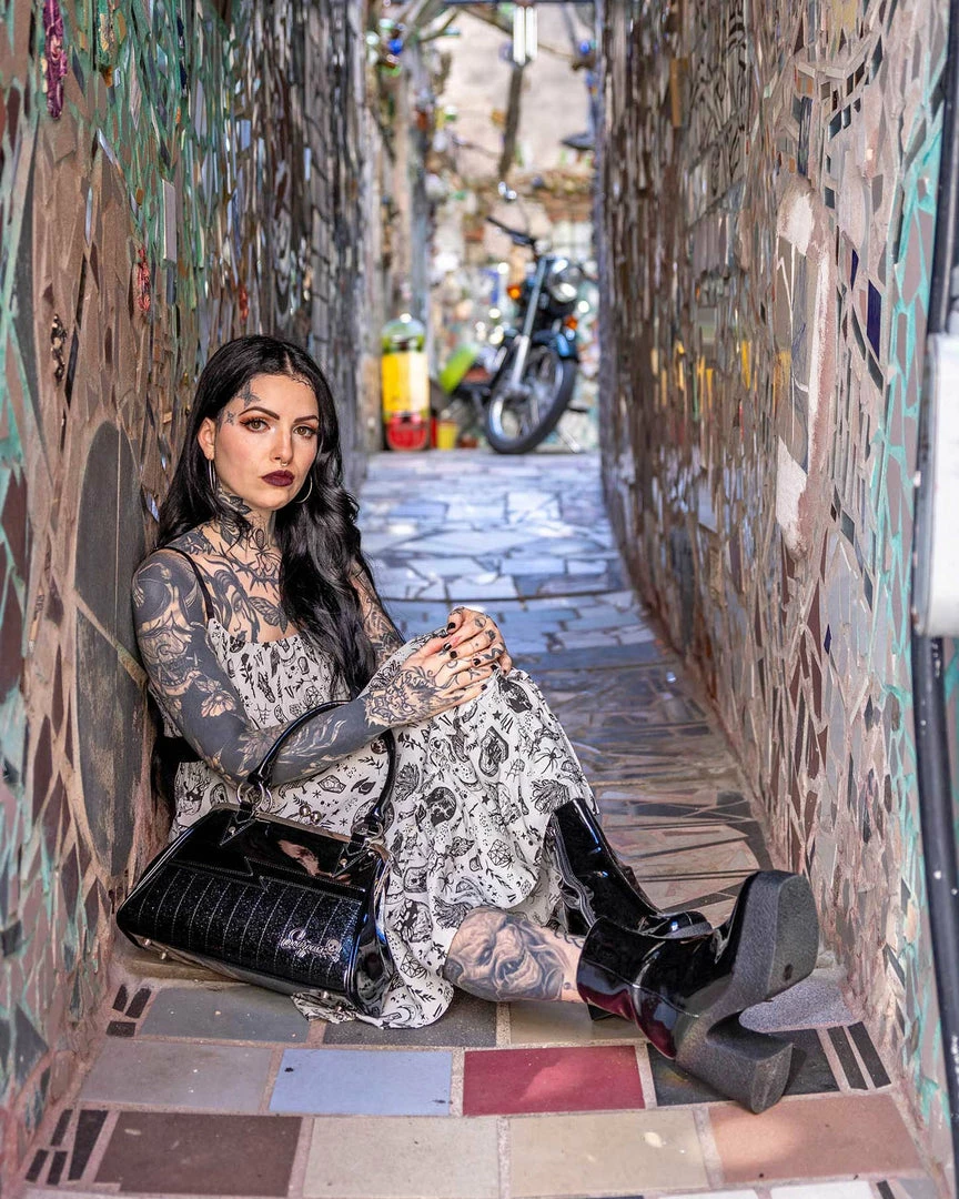 Shock me, baby! Make a truly electrifying entrance with our newest Shock Me Handbag in a stunning black on black retro design. Crafted from a high quality, high gloss, black vinyl, this 1960s inspired silhouette is complimented by the front bolt design, black glitter vinyl accents, metal feet and silver Sourpuss brand hardware. The top closes shut with a kisslock closure, while the interior reveals a fun black and white striped lining complete with pockets.