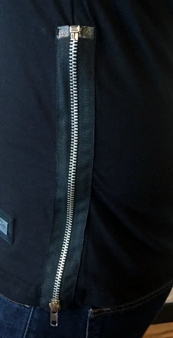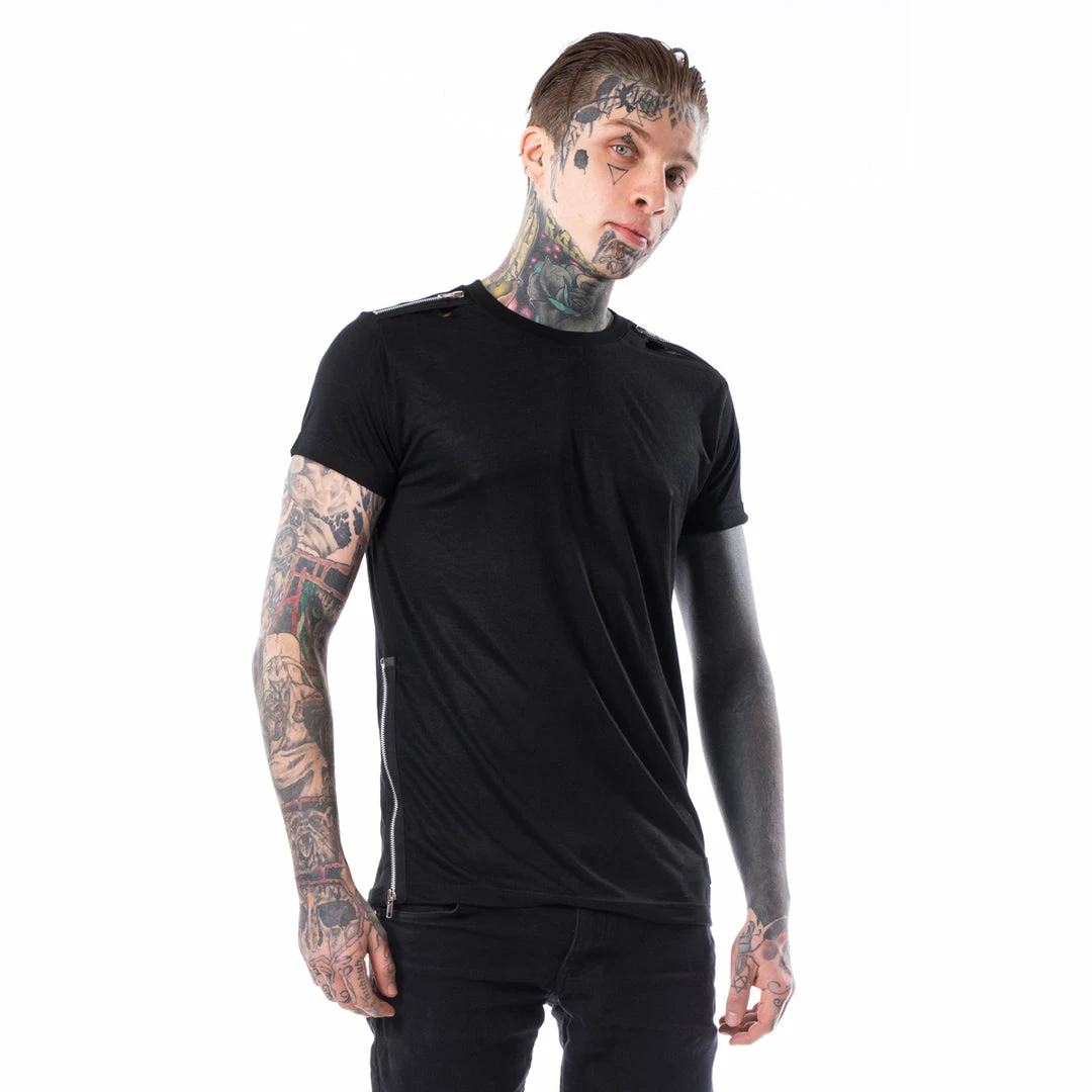 Black, slightly stretchy t-shirt with zipper accents on the shoulders and sides.