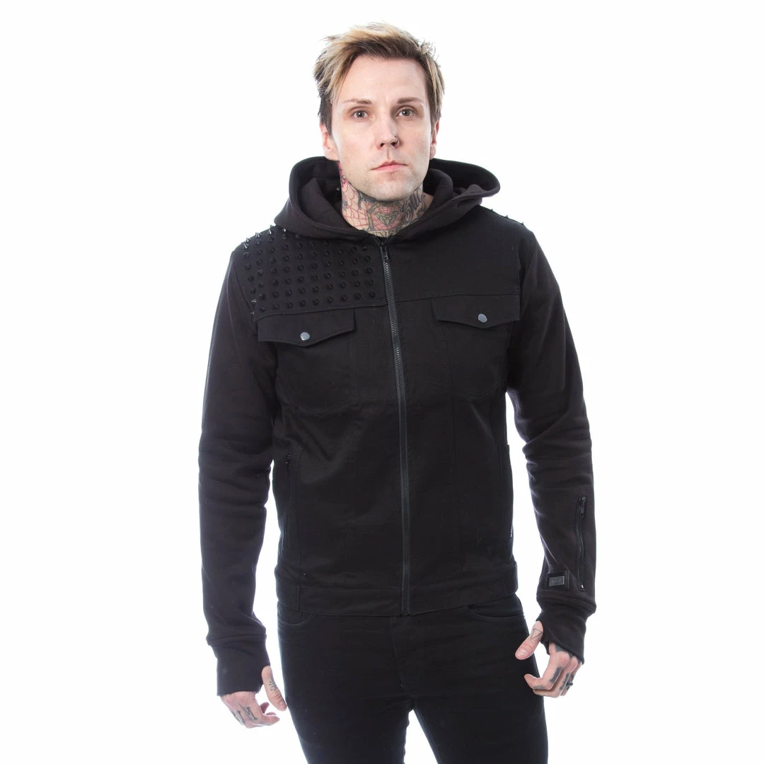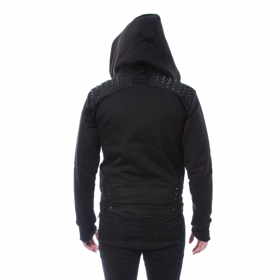 Black Blaze hooded jacket by Vixxsin. Features Black spikes across the shoulders and on the front right, and lower back, thumbholes, and zipper accents. Fits true to size, not oversized.